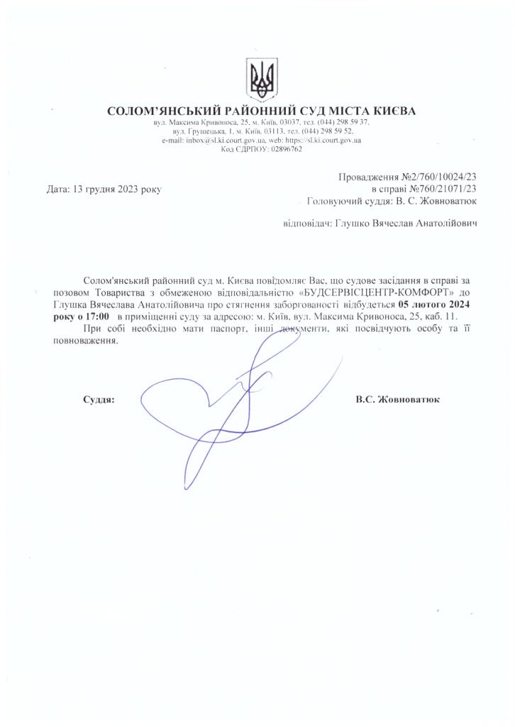 Оголошення про виклик до суду про справі 760/21071/23 Глушко В.А.