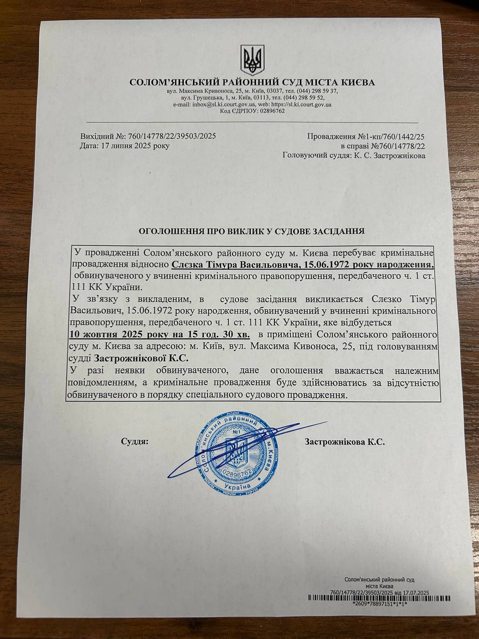 Оголошення про виклик до суду про справі 760/14778/22 Слєзко Т.В.