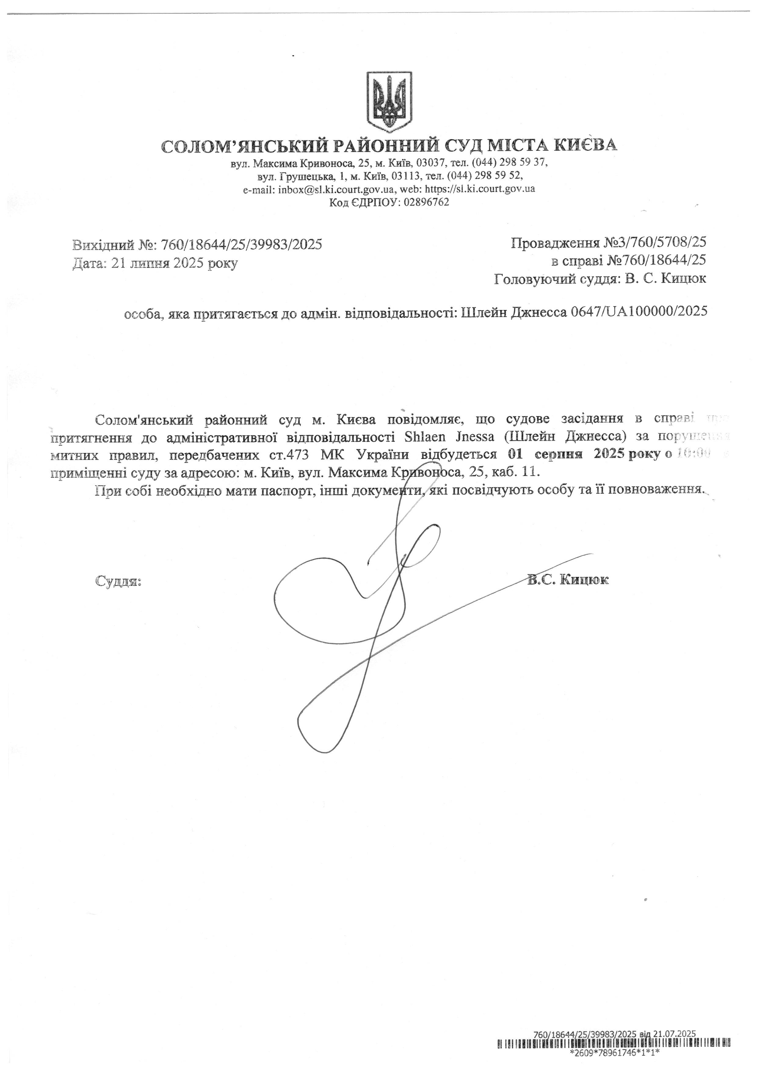 Оголошення про виклик до суду про справі 760/18644/25 Шлейн Джнесса