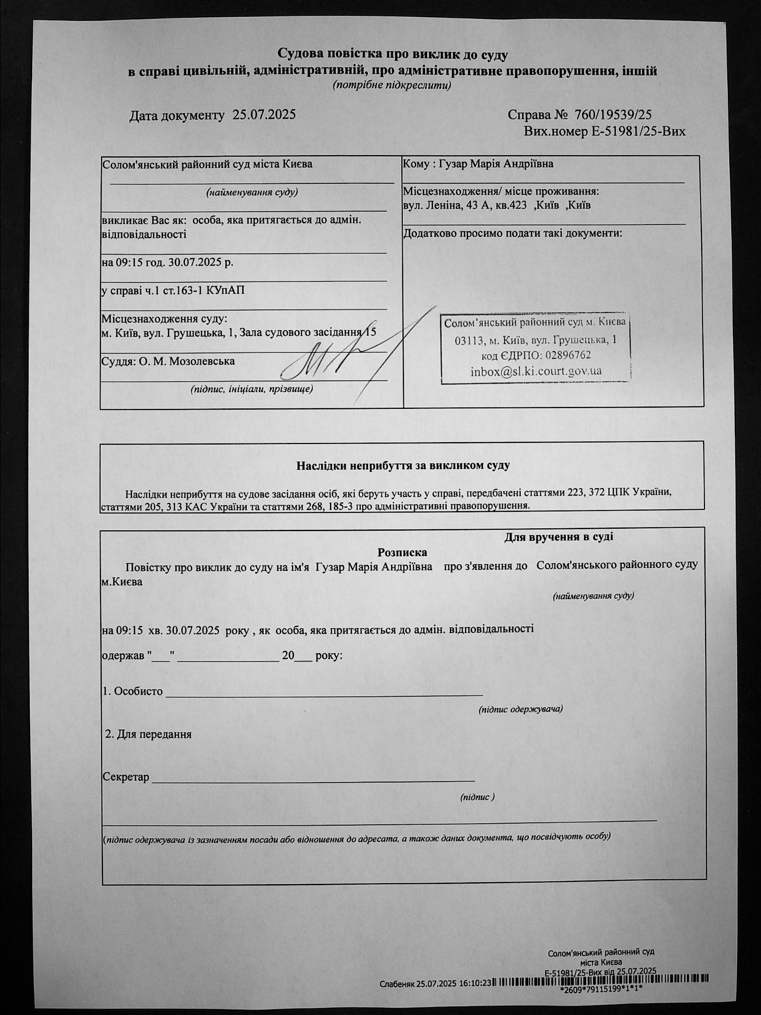 Оголошення про виклик до суду про справі 760/19539/25 Гузар М.А.