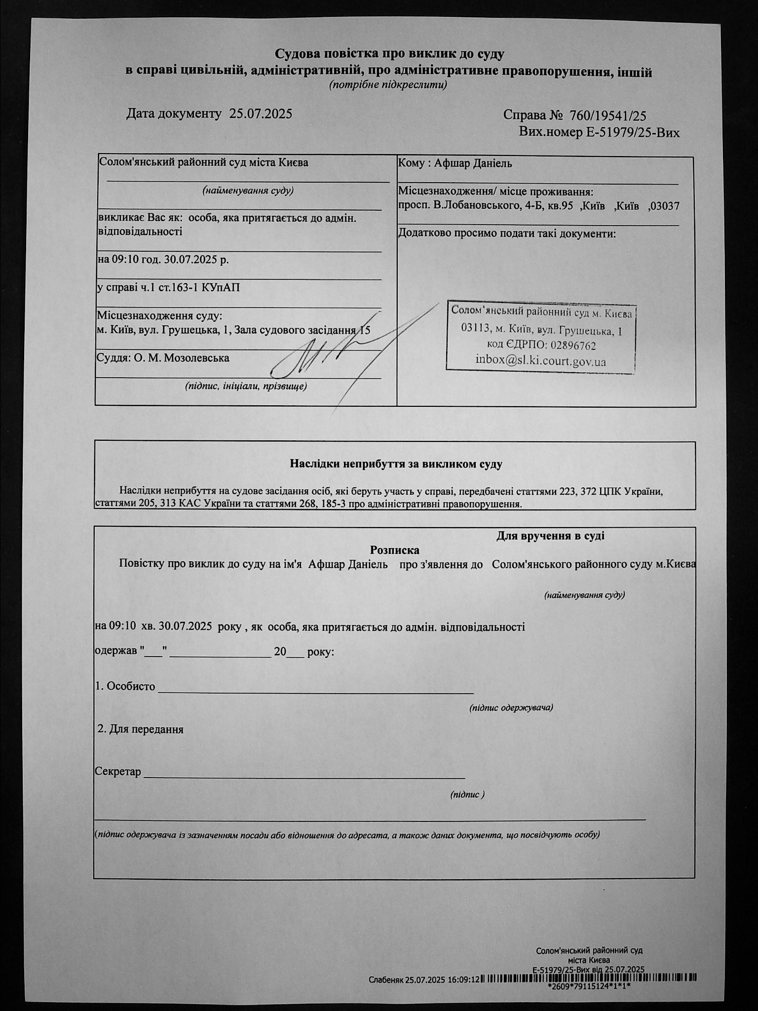 Оголошення про виклик до суду про справі 760/19541/25 Афшар Даніель