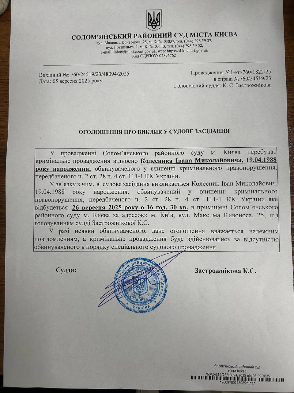 Оголошення про виклик до суду про справі 760/24519/23 Колесник І.М.