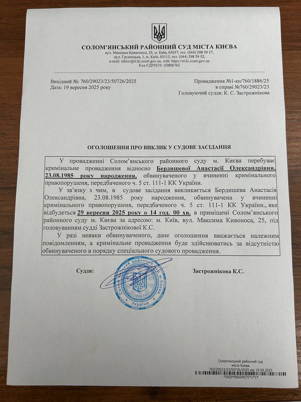 Оголошення про виклик до суду про справі 760/29023/23 Бердишева А.О.