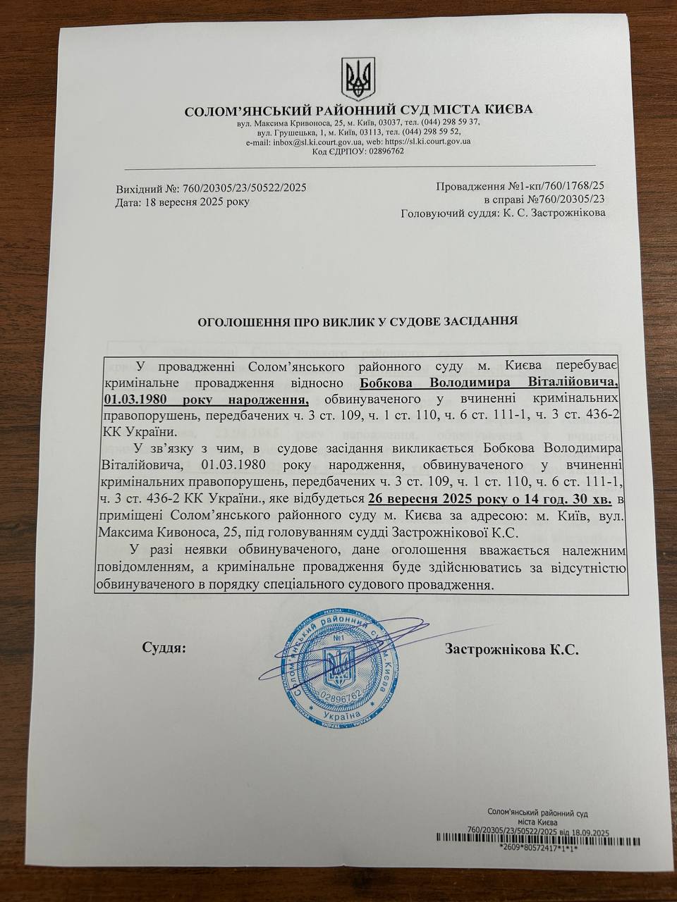 Оголошення про виклик до суду про справі 760/20305/23 Бобков В.В.