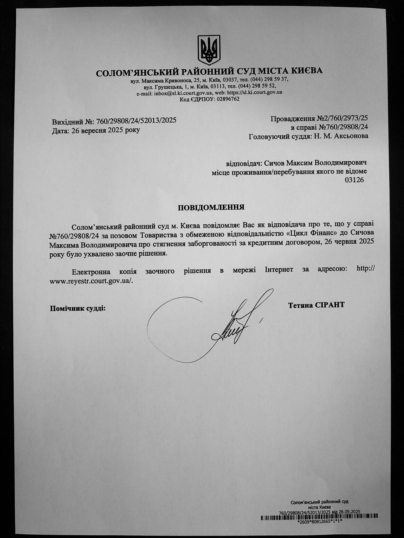 Оголошення про виклик до суду про справі 760/29808/24 Сичов М.В.