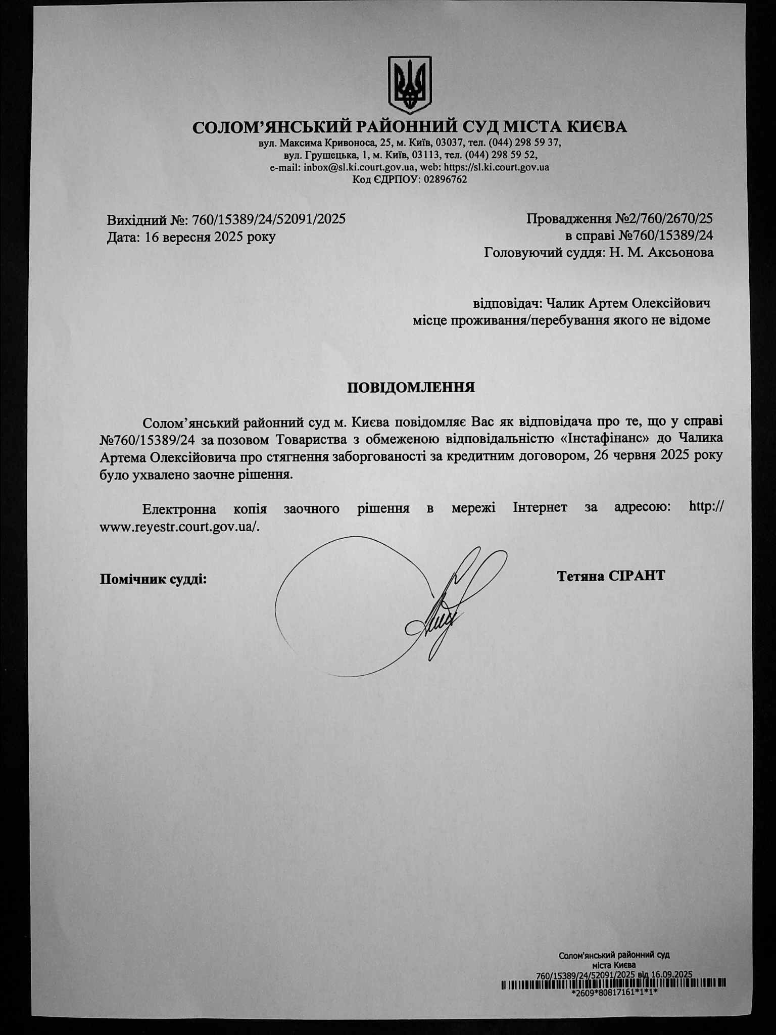 Оголошення про виклик до суду про справі 760/15389/24 Чалик А.О.