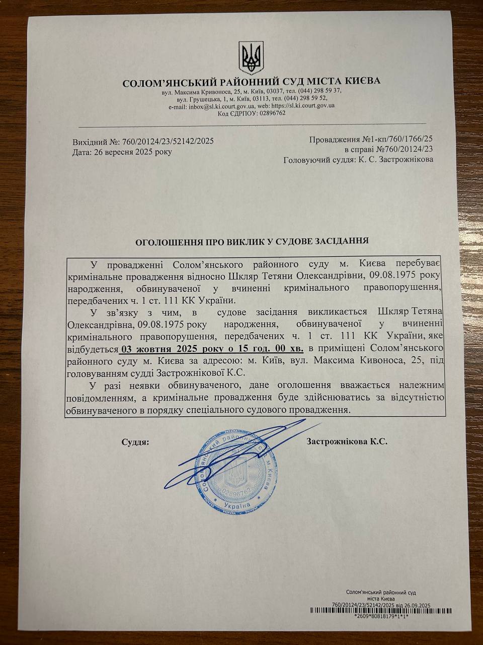 Оголошення про виклик до суду про справі 760/20124/23 Шкляр Т.О.
