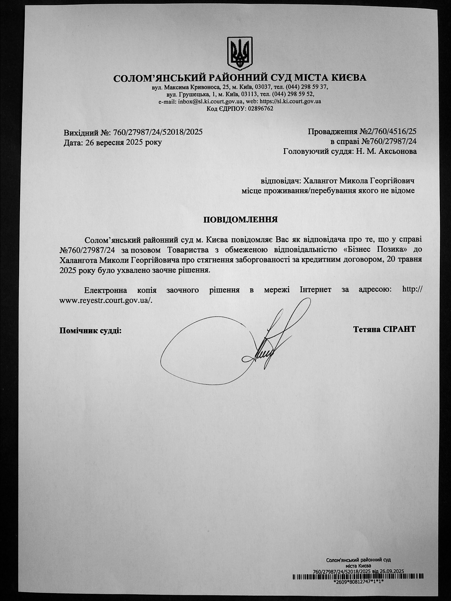 Оголошення про виклик до суду про справі 760/27987/24 Халангот М.Г.