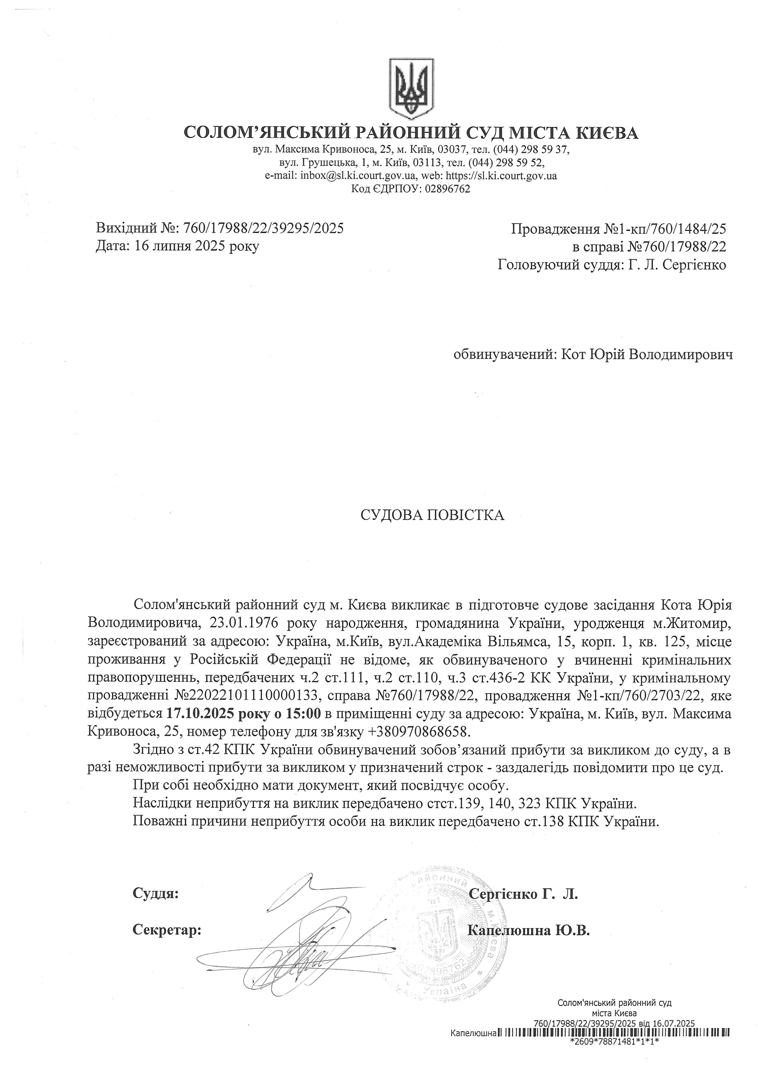 Оголошення про виклик до суду про справі 760/17988/22 Кот Ю.В.