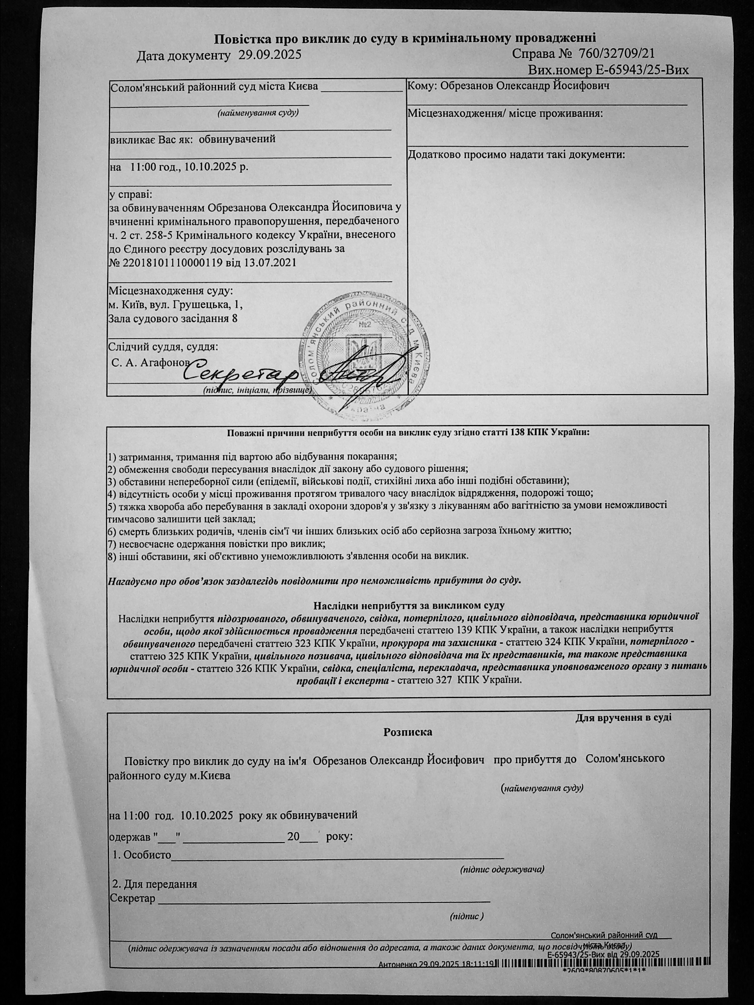 Оголошення про виклик до суду про справі 760/32709/21 Обрезанов О.Й.