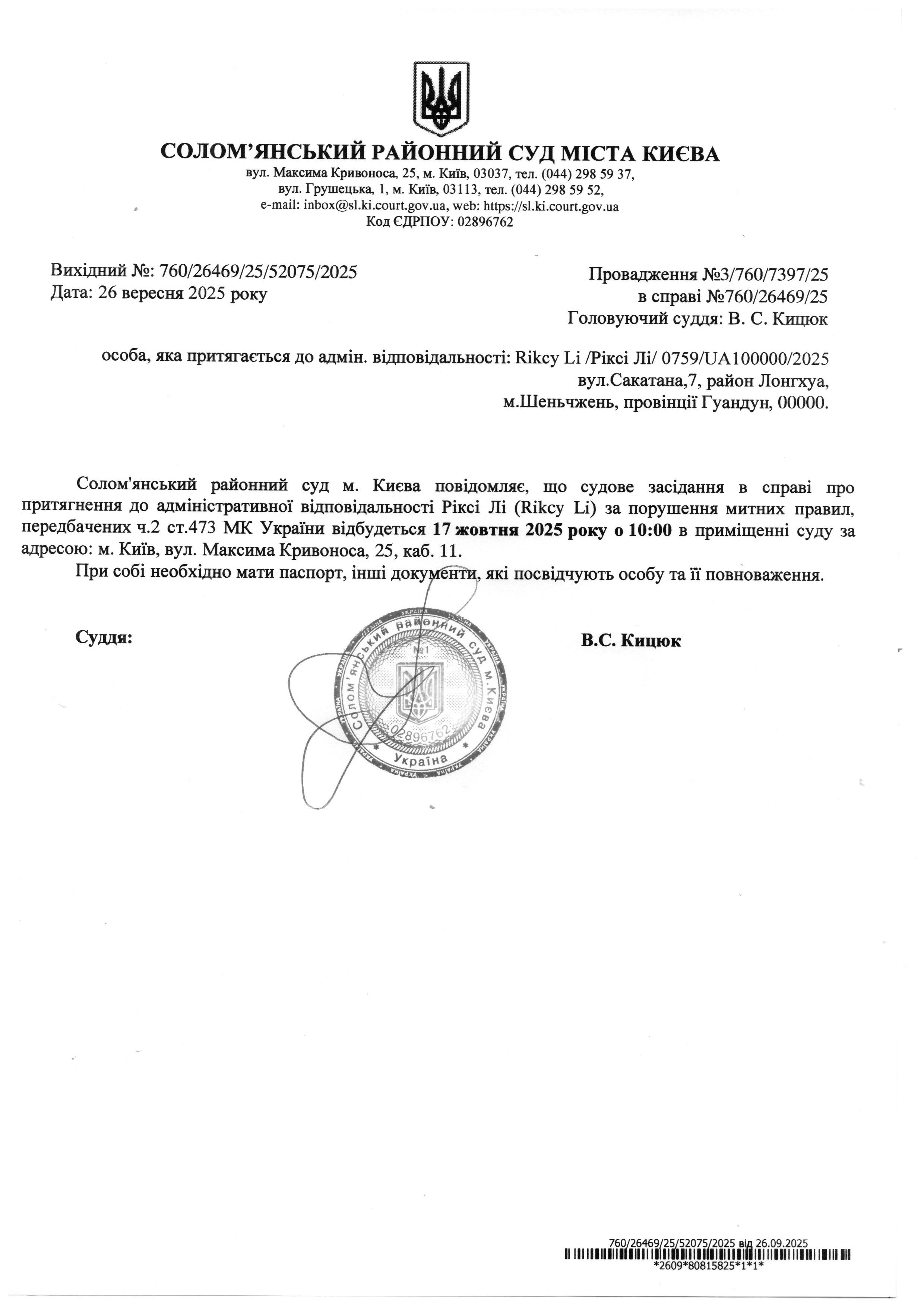 Оголошення про виклик до суду про справі 760/26469/25 Ріксі Лі