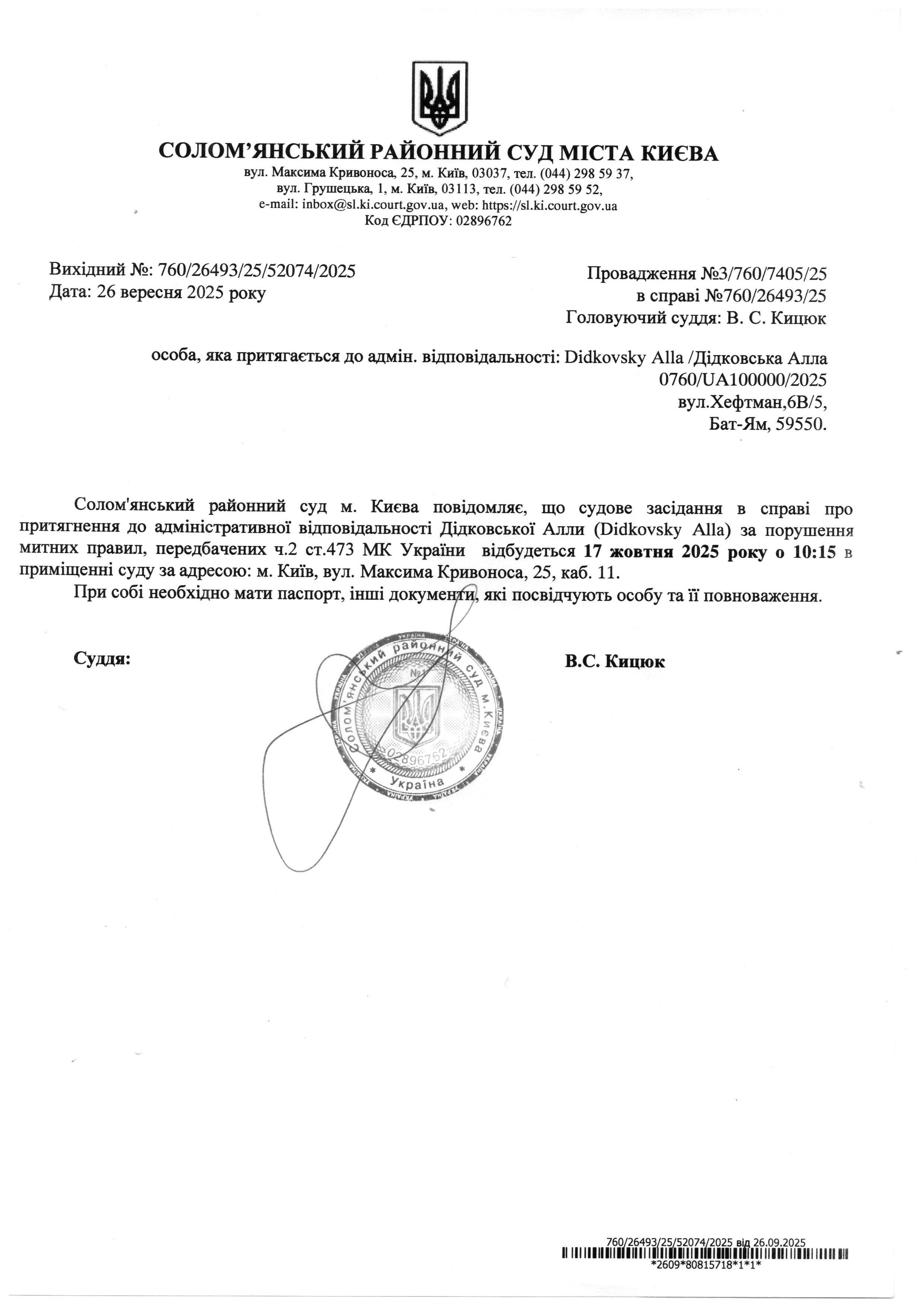Оголошення про виклик до суду про справі 760/26493/25 Дідковська Алла