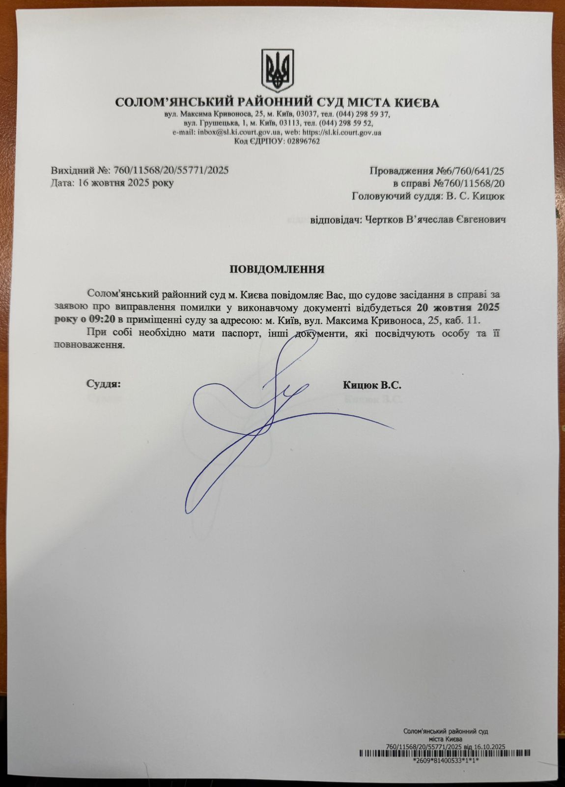 Оголошення про виклик до суду про справі 760/11568/20 Чертков В.Є.