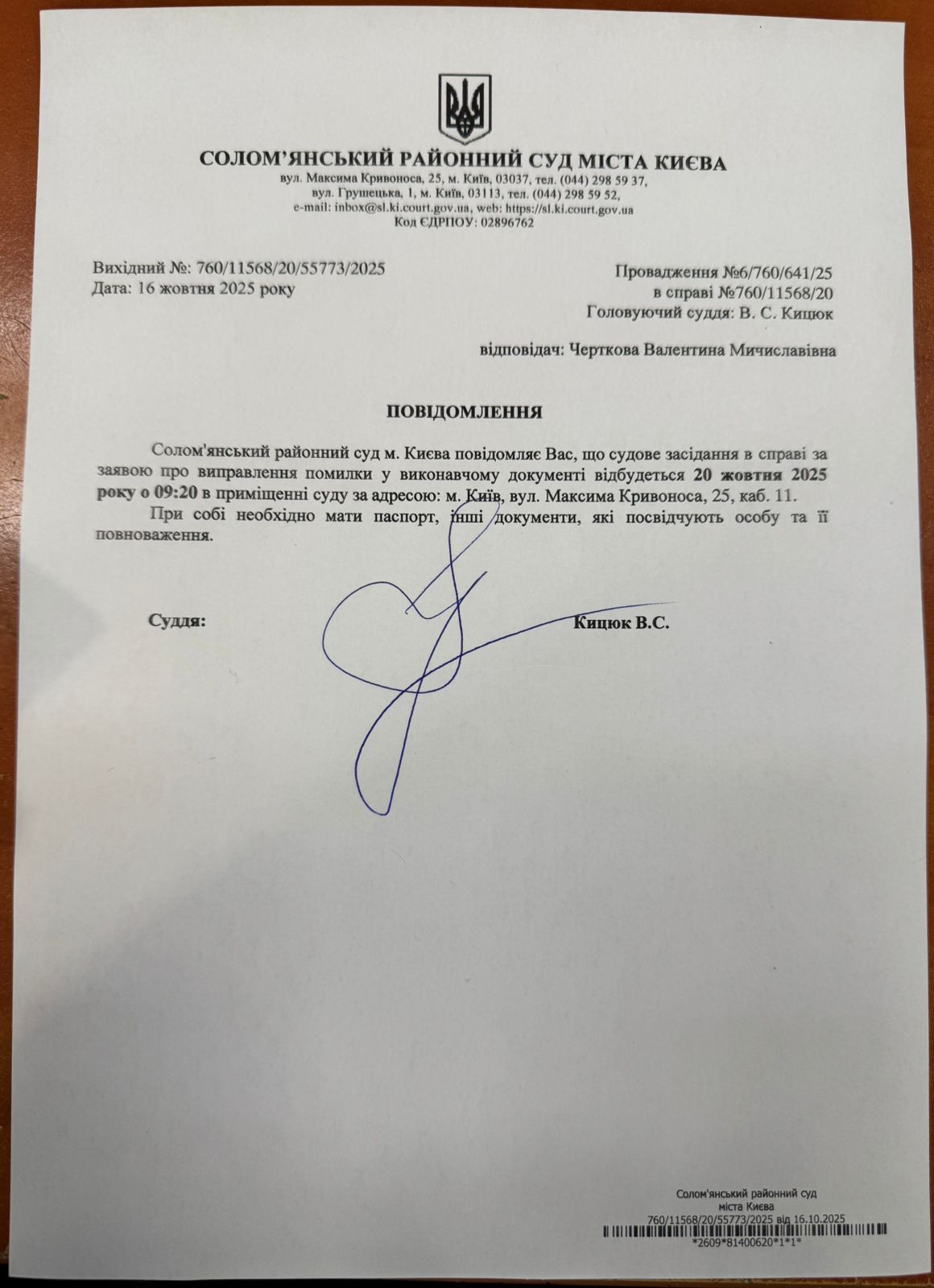Оголошення про виклик до суду про справі 760/11568/20 Черткова В.М.