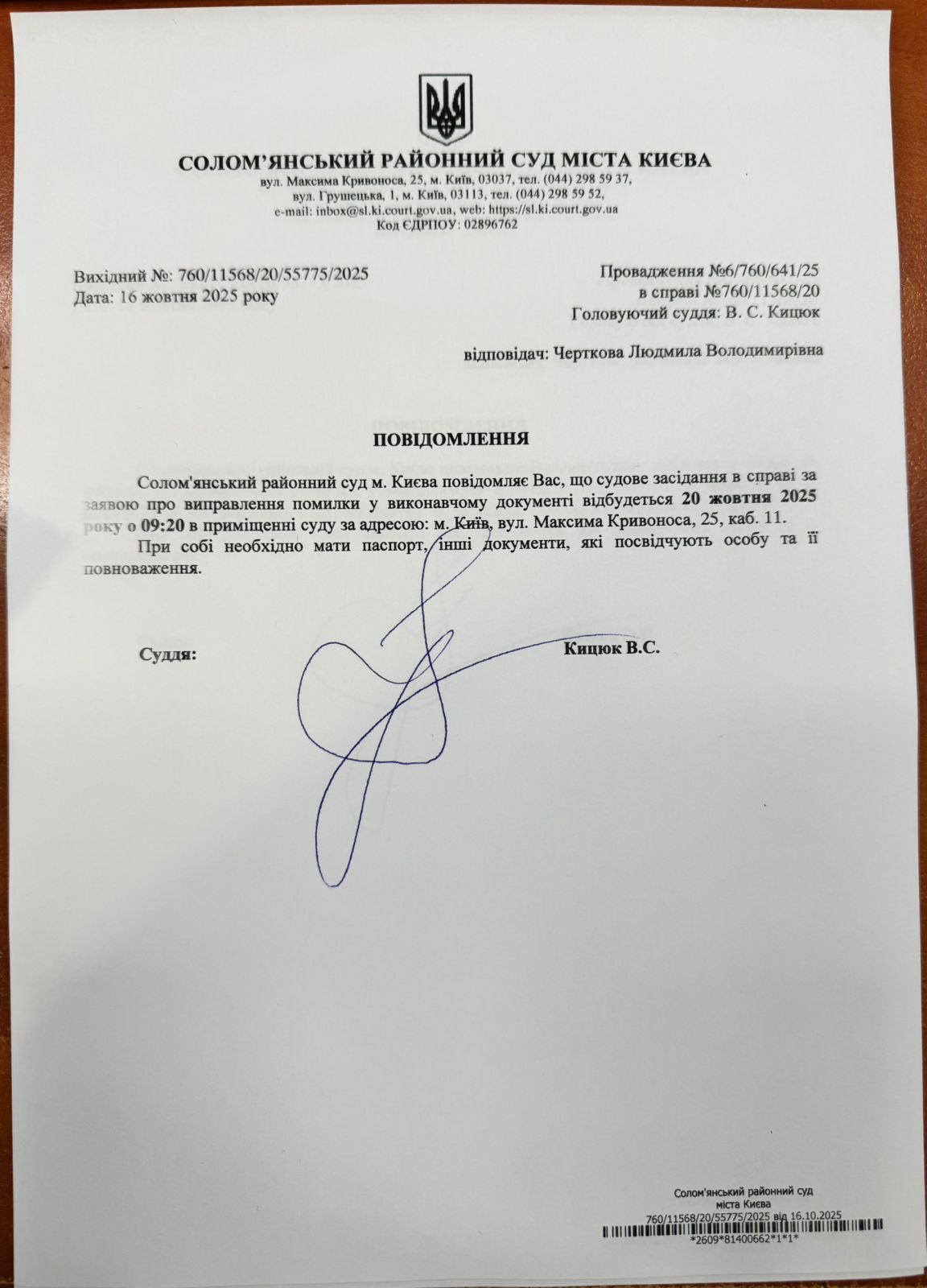 Оголошення про виклик до суду про справі 760/11568/20 Черткова Л.В.