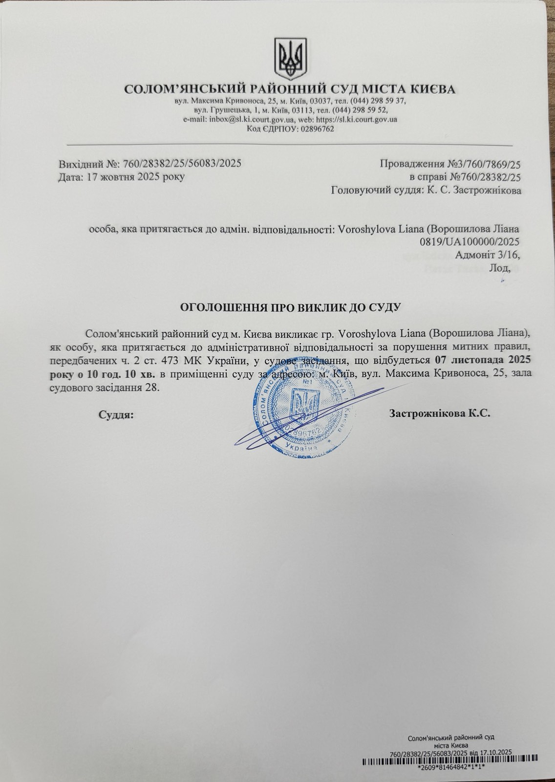 Оголошення про виклик до суду про справі 760/28382/25 Ворошилова Ліана