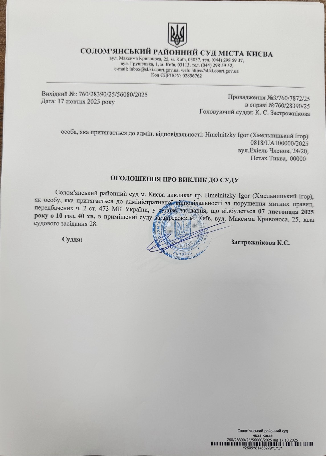 Оголошення про виклик до суду про справі 760/28390/25 Хмельницький Ігор