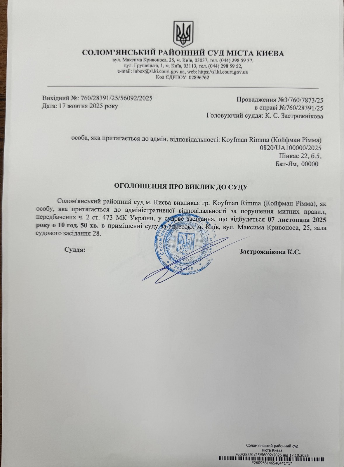 Оголошення про виклик до суду про справі 760/28391/25 Койфман Рімма