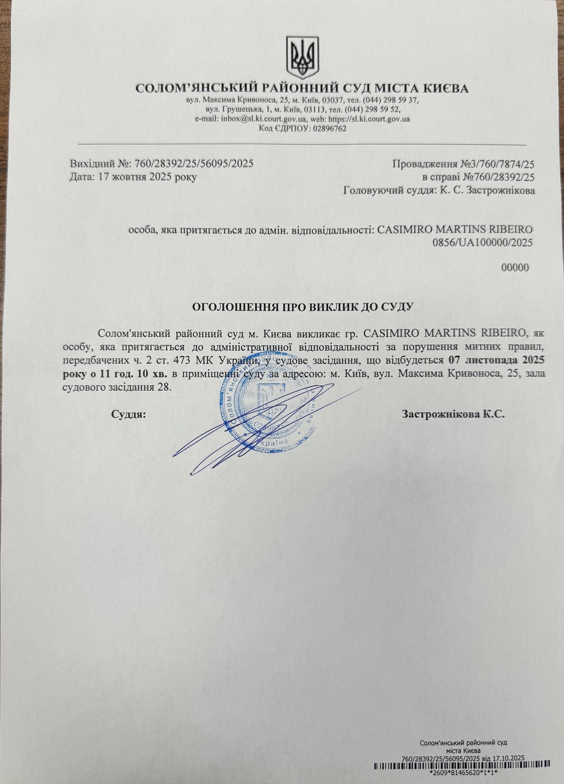 Оголошення про виклик до суду про справі 760/28392/25 CASIMIRO MARTINS RIBEIRO