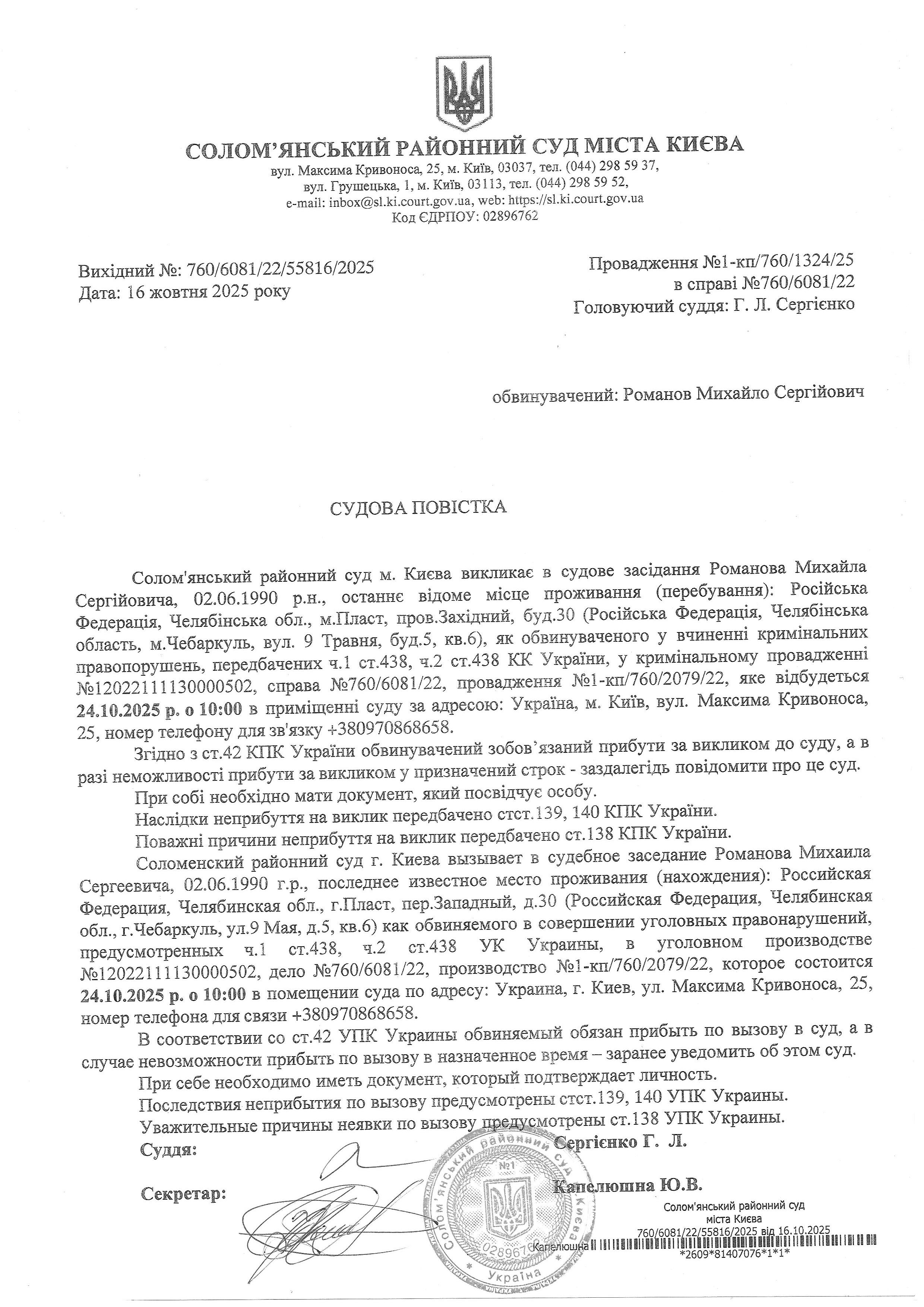 Оголошення про виклик до суду про справі 760/6081/22 Романов М.С.