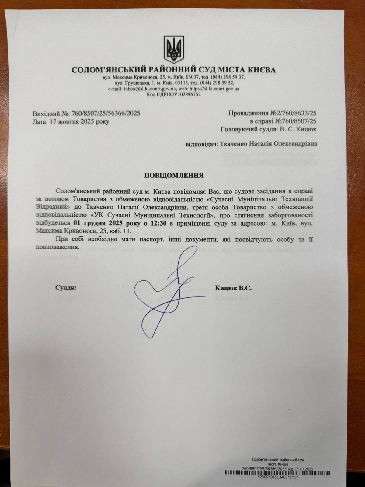 Оголошення про виклик до суду про справі 760/8507/25 Ткаченко Н.О.