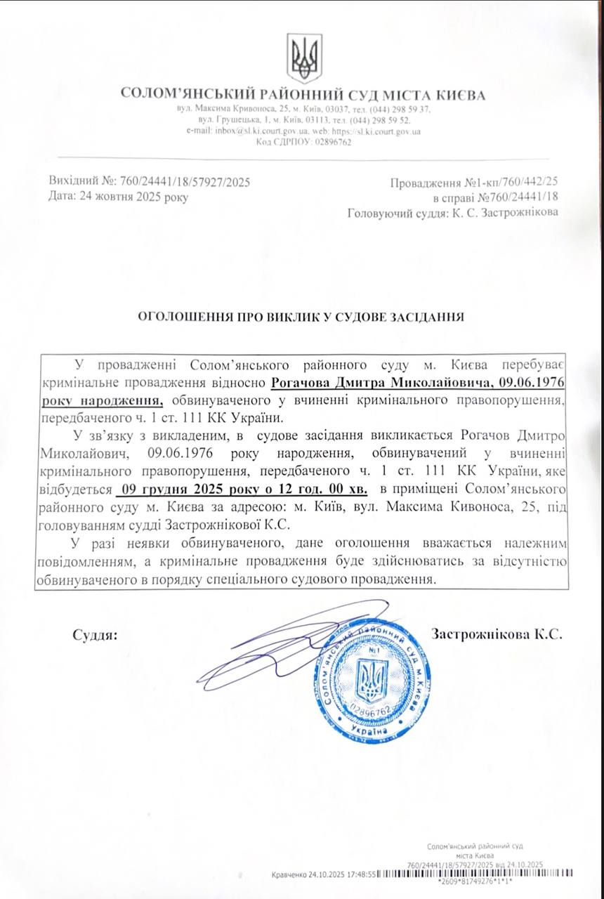 Оголошення про виклик до суду про справі 760/24441/18 Рогачов Д.М.