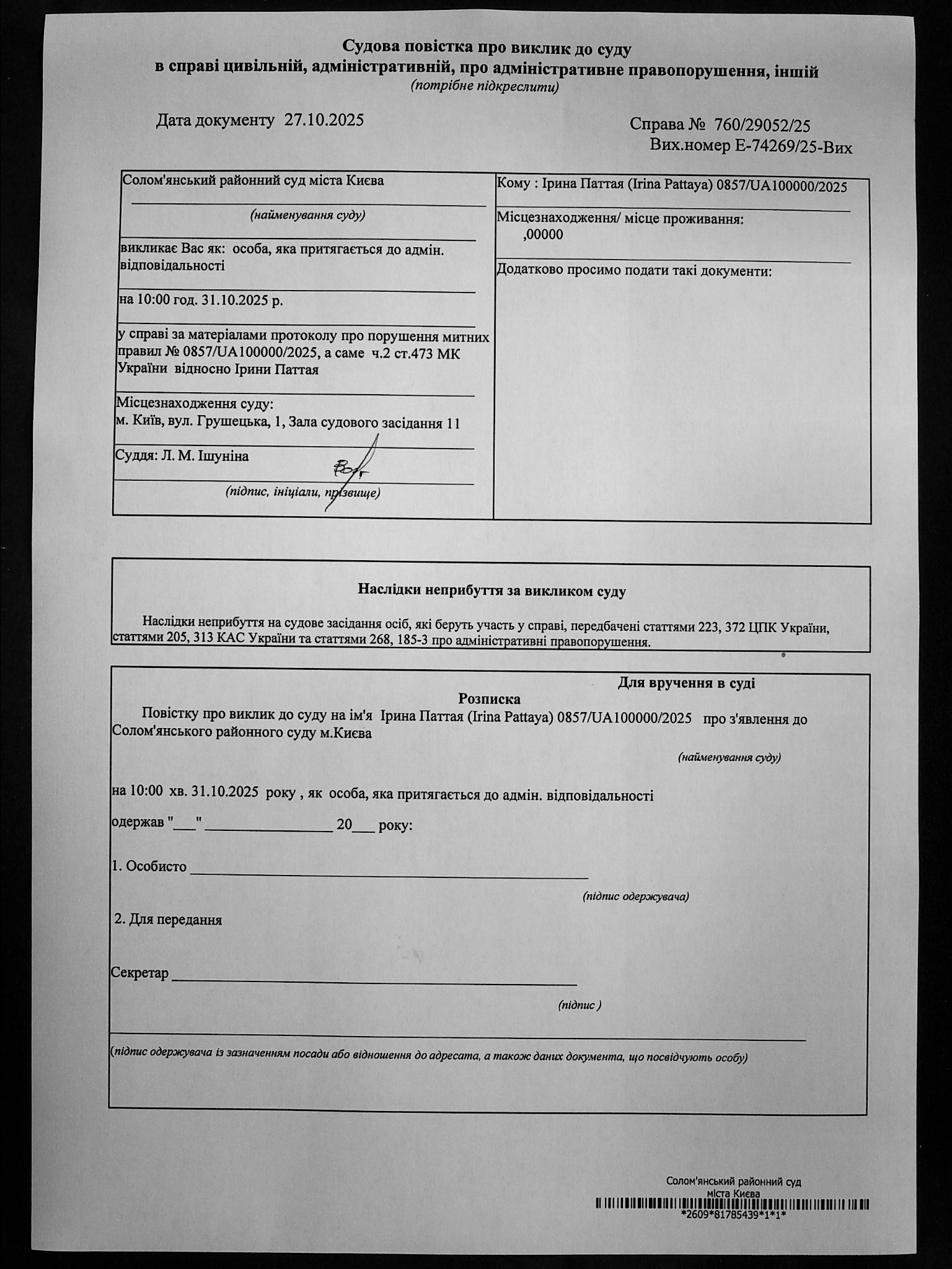 Оголошення про виклик до суду про справі 760/29052/25 Ірина Паттая