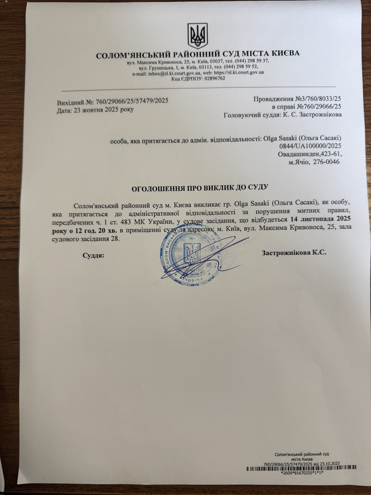 Оголошення про виклик до суду про справі 760/29066/25 Olga Sasaki