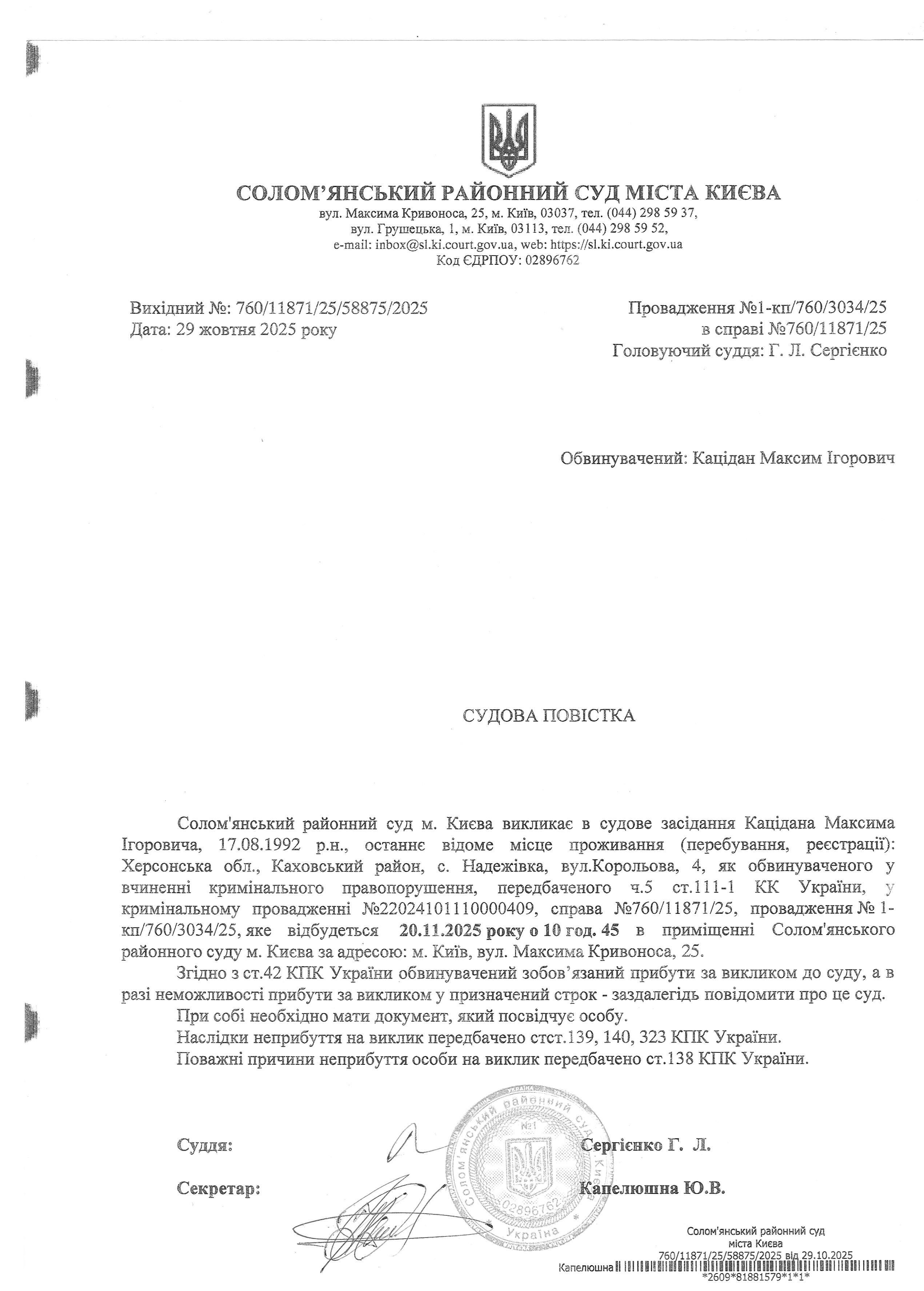 Оголошення про виклик до суду про справі 760/11871/25 Кацідан М.І.