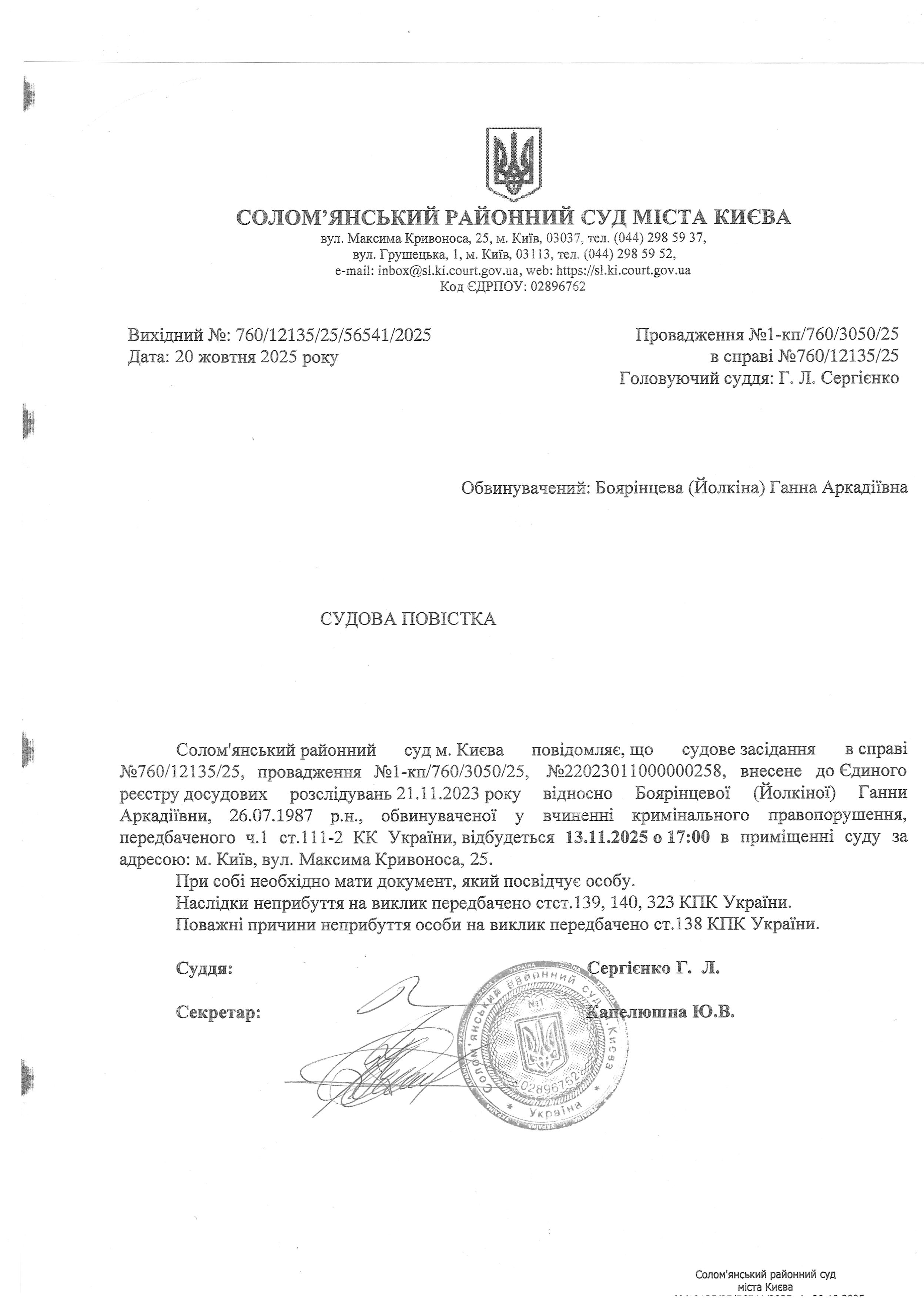 Оголошення про виклик до суду про справі 760/12135/25 Боярінцева Г.А.