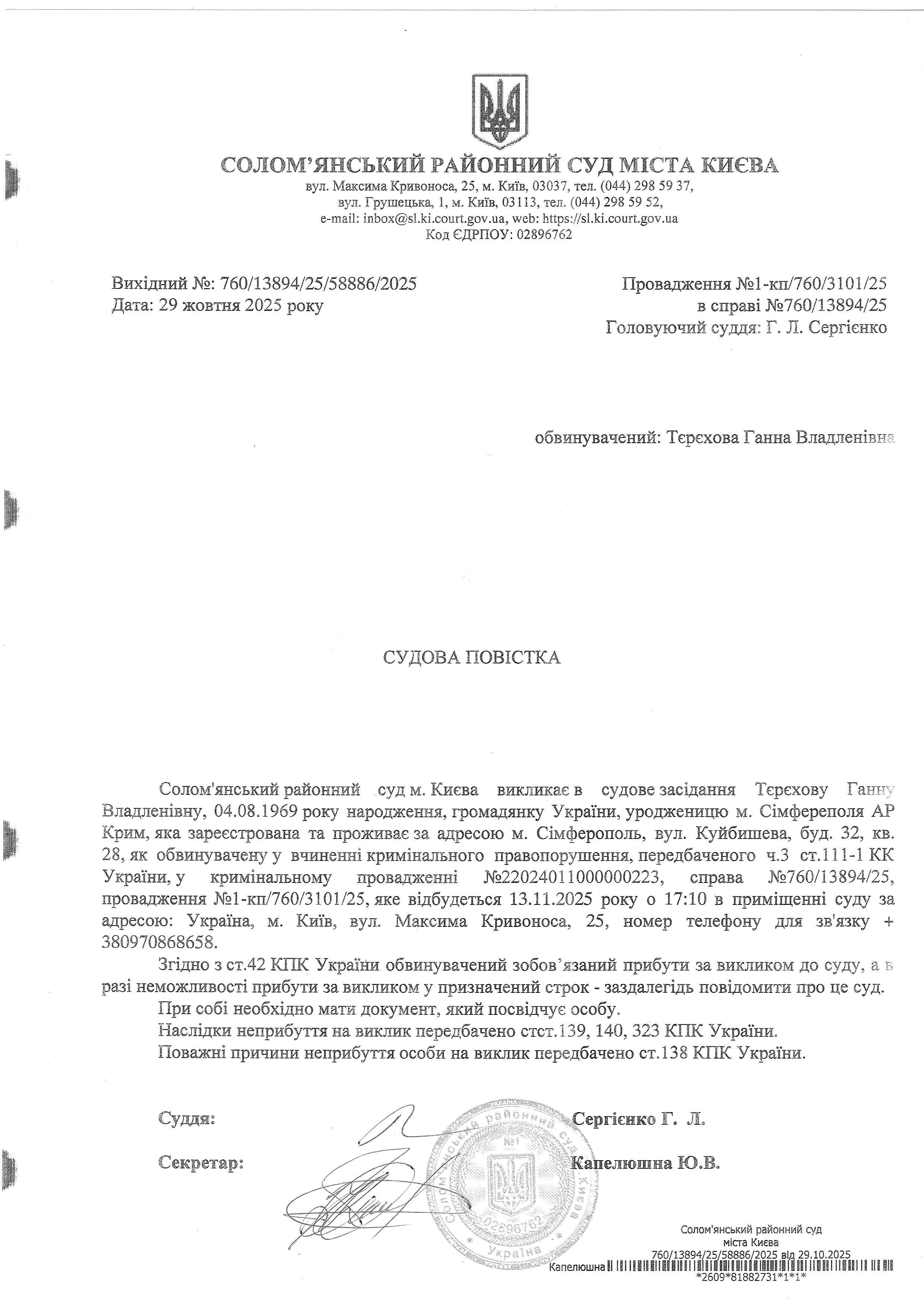 Оголошення про виклик до суду про справі 760/13894/25 Тєрєхова Г.В.