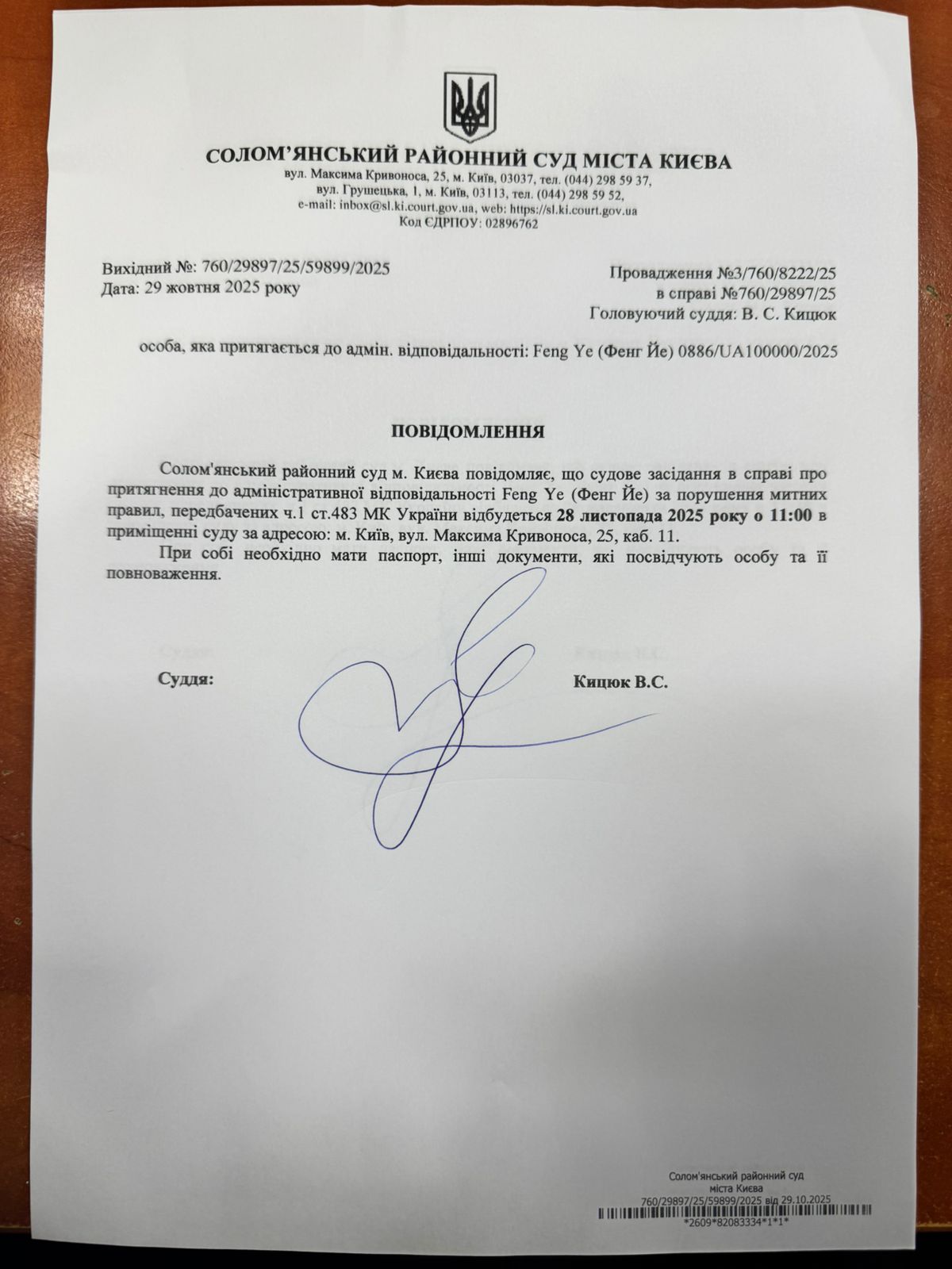 Оголошення про виклик до суду про справі 760/29897/25 Фенг Йе