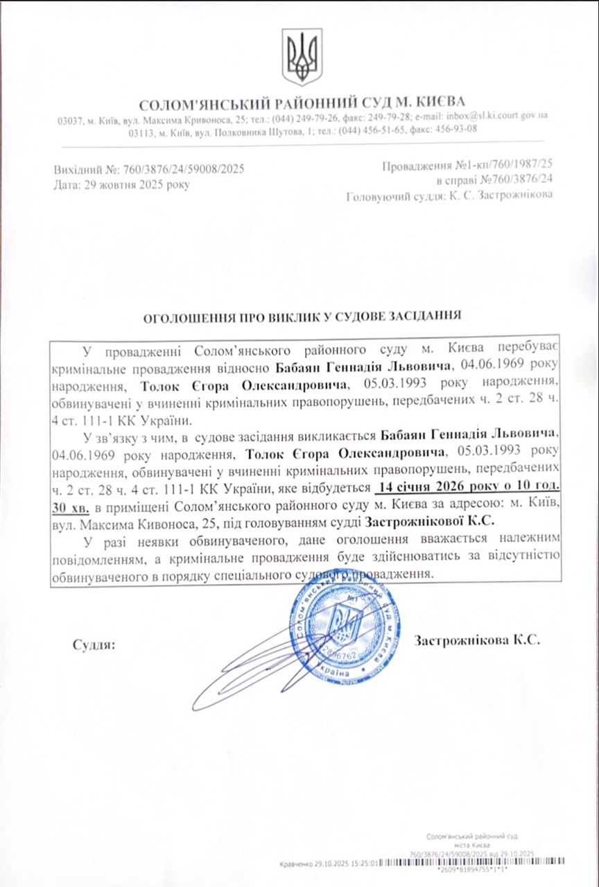 Оголошення про виклик до суду про справі 760/3876/24 Бабаян Г.Л.