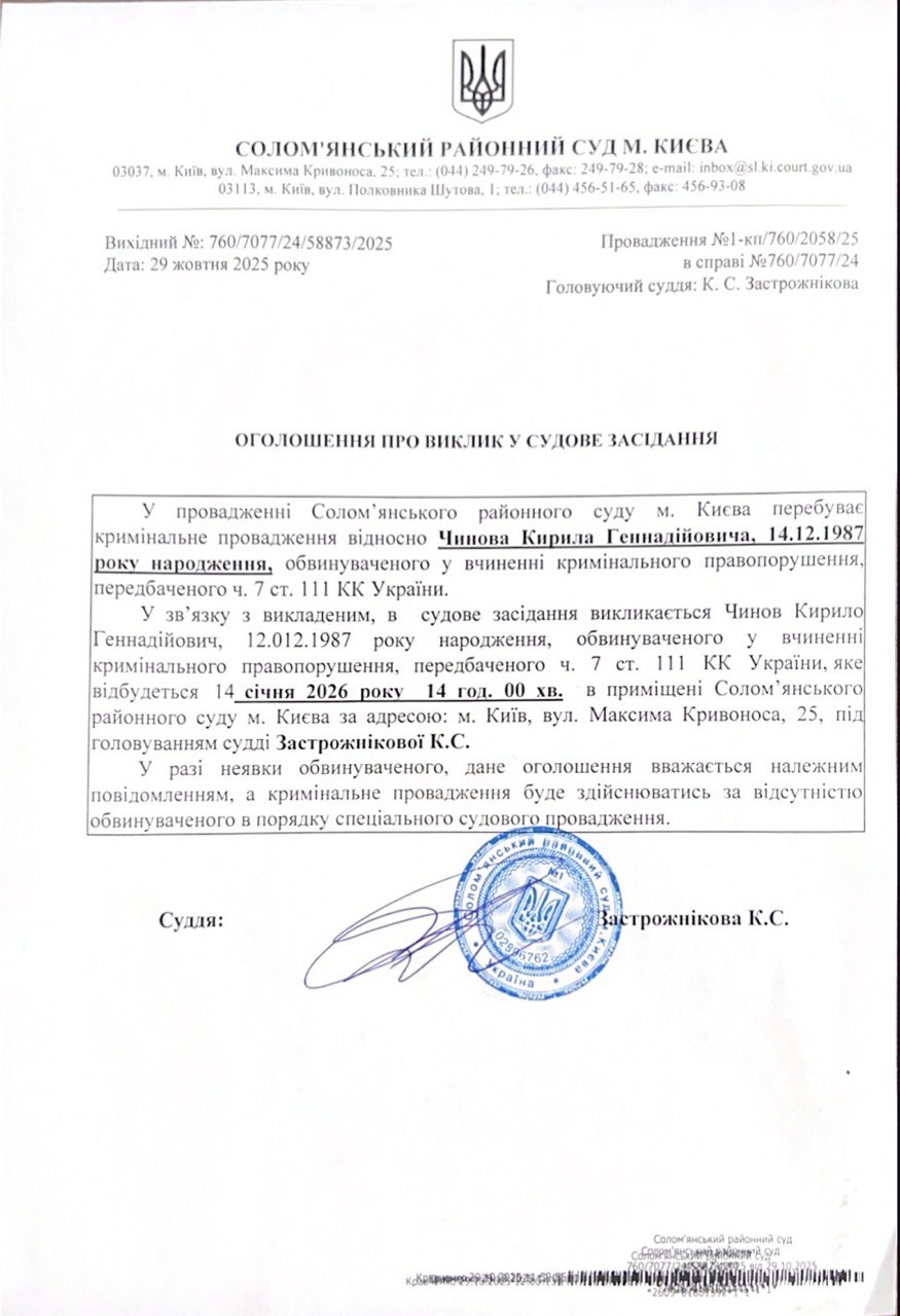 Оголошення про виклик до суду про справі 760/7077/24 Чинов К.Г.