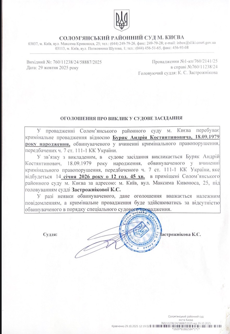 Оголошення про виклик до суду про справі 760/11238/24 Буряк А.К.