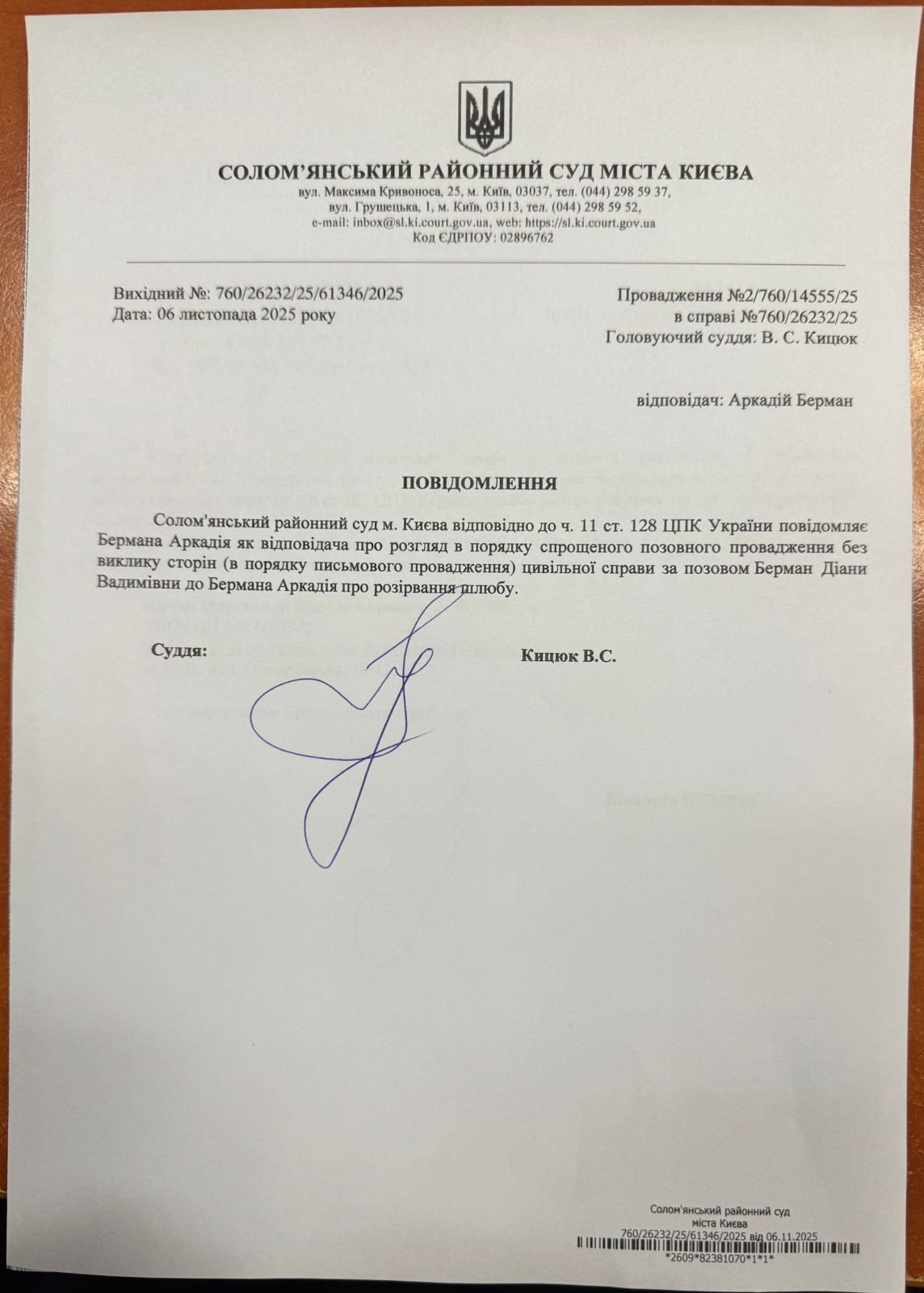 Оголошення про виклик до суду про справі 760/26232/25 Аркадій Берман