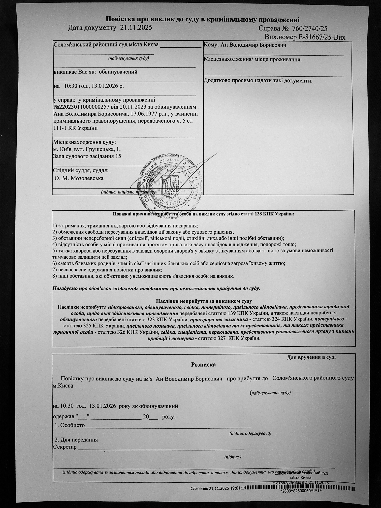 Оголошення про виклик до суду про справі 760/2740/25 Ан В.Б.