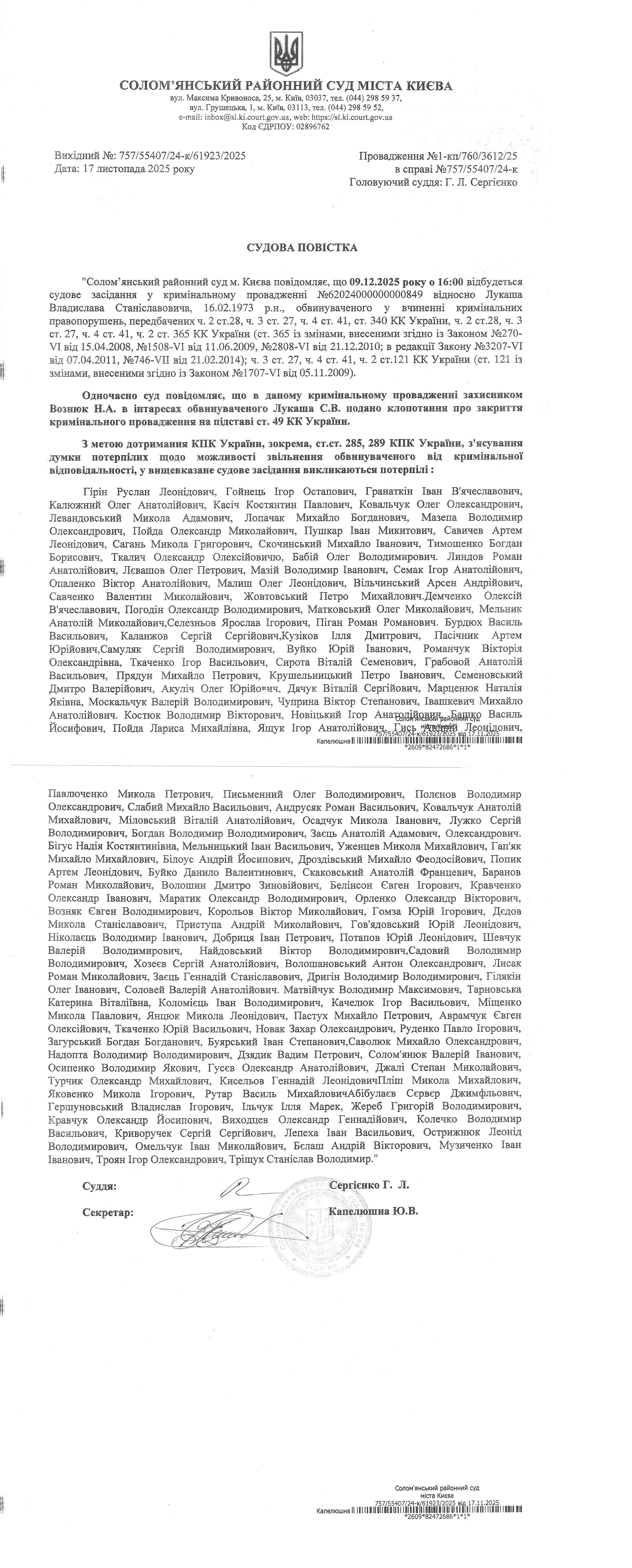 Оголошення про виклик до суду про справі 757/55407/24-к Лукаш В.С.