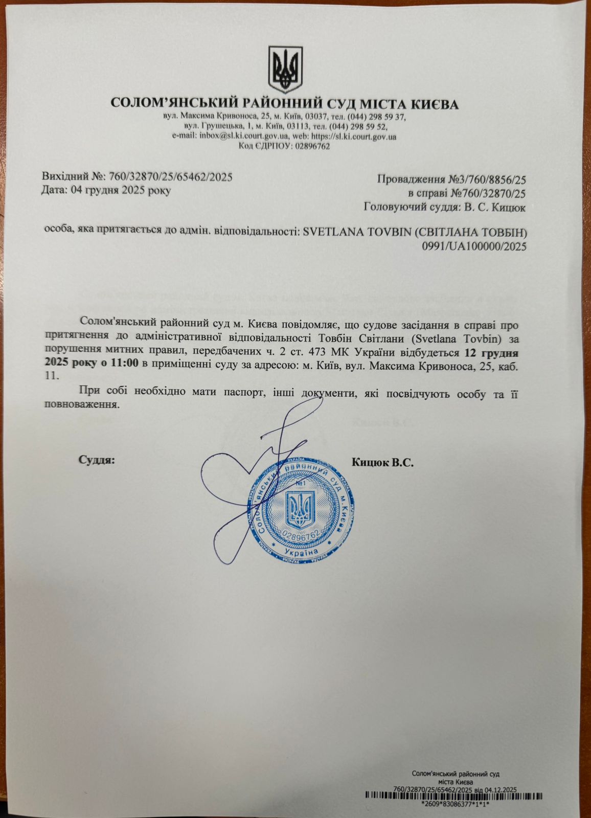 Оголошення про виклик до суду про справі 760/32870/25 Світлана Товбін