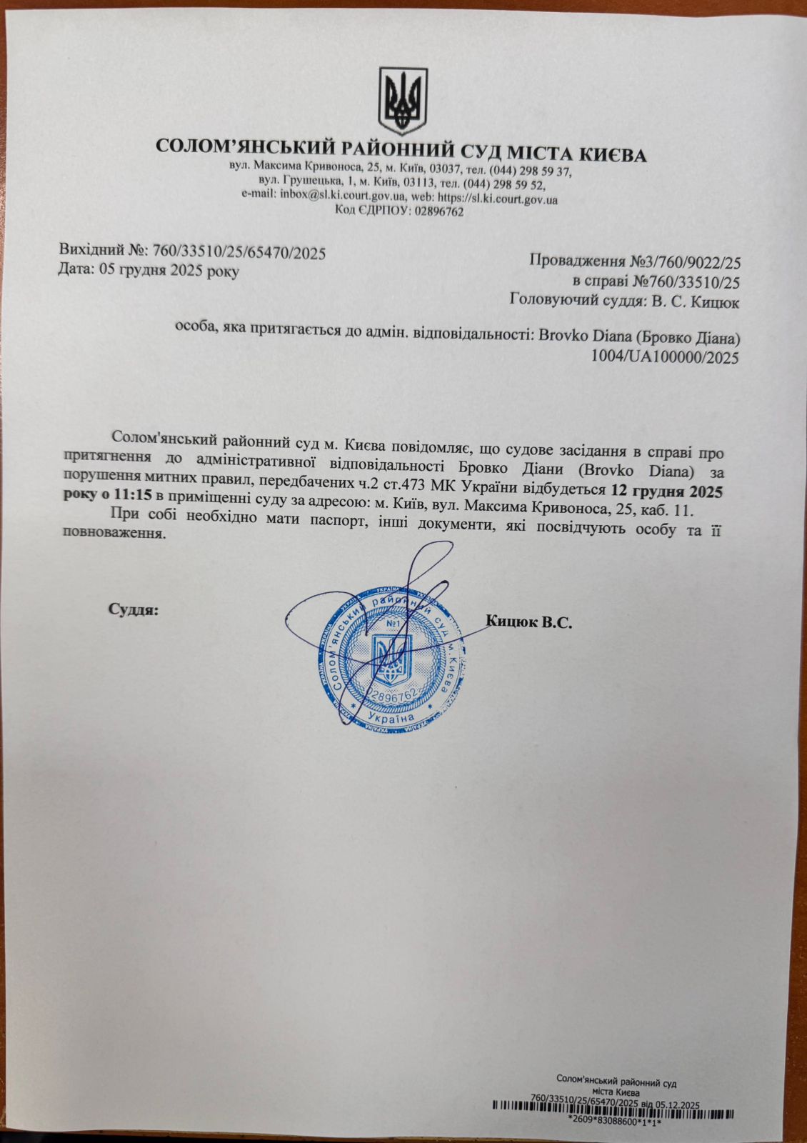 Оголошення про виклик до суду про справі 760/33510/25 Бровко Діана