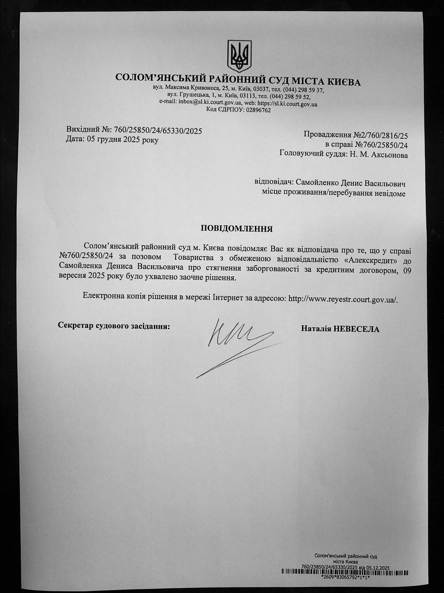 Оголошення про виклик до суду про справі 760/25850/24 Самойленко Д.В.