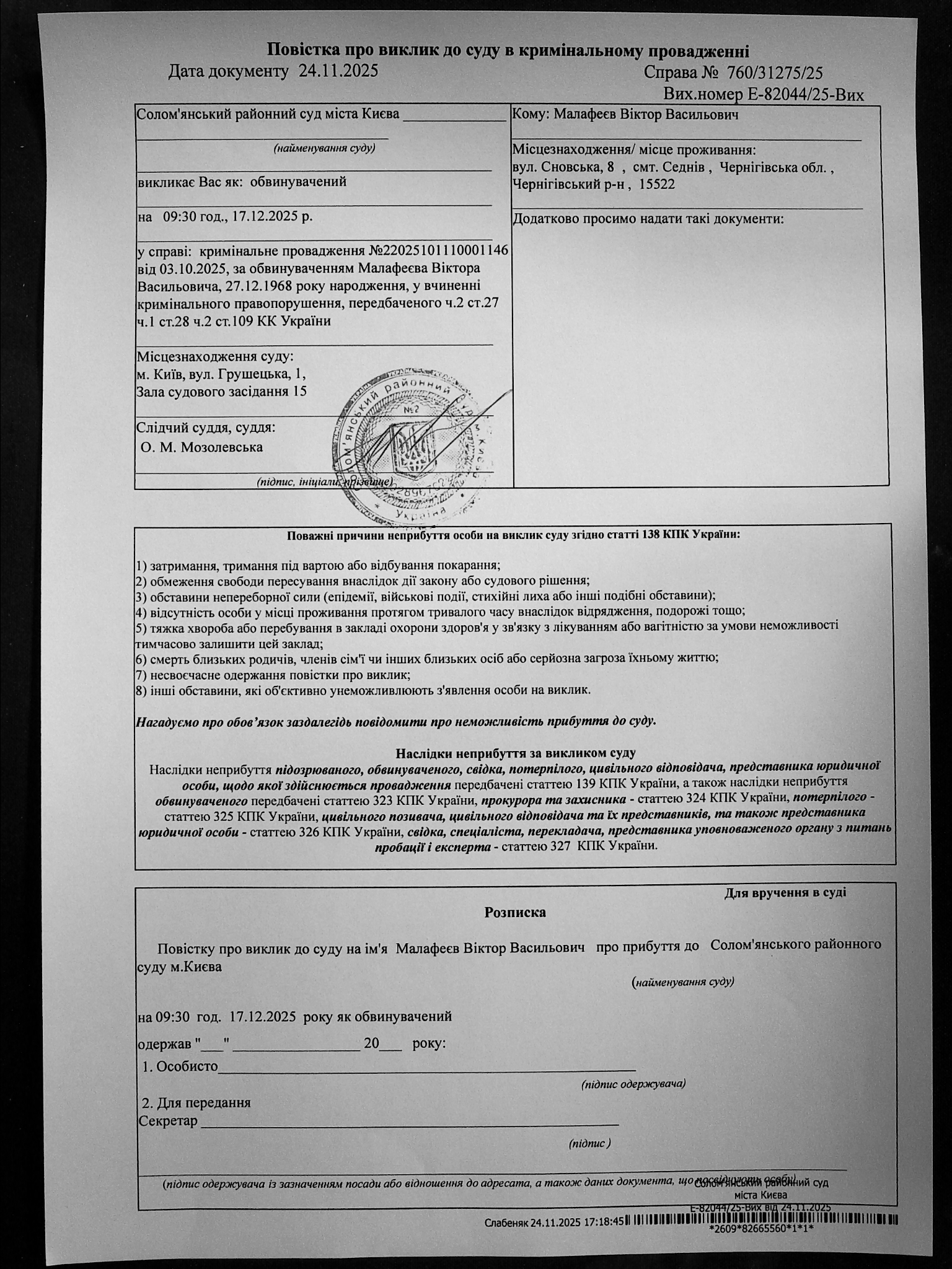 Оголошення про виклик до суду про справі 760/31275/25 Малафеєв В.В.
