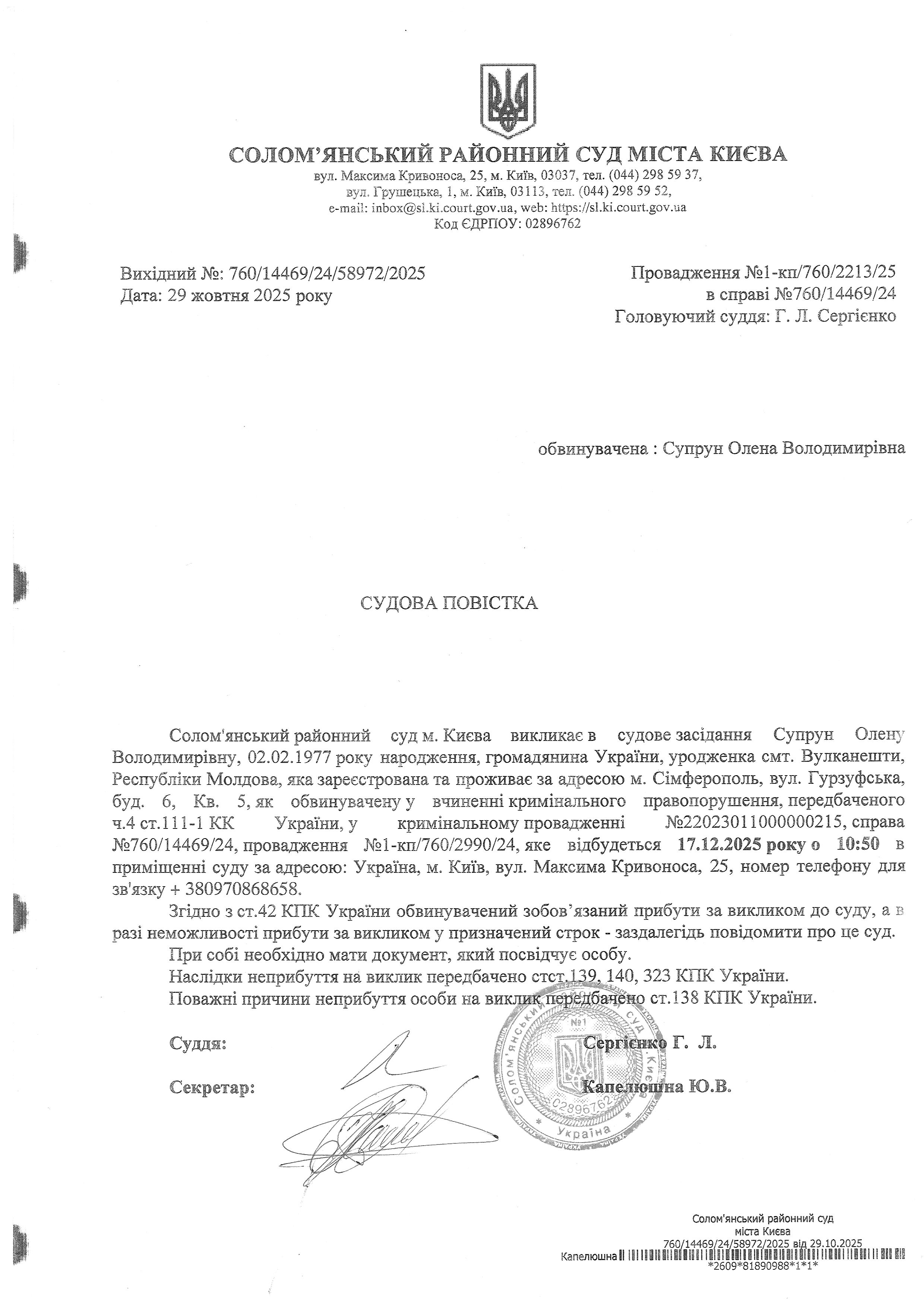 Оголошення про виклик до суду про справі 760/14469/24 Супрун О.В.