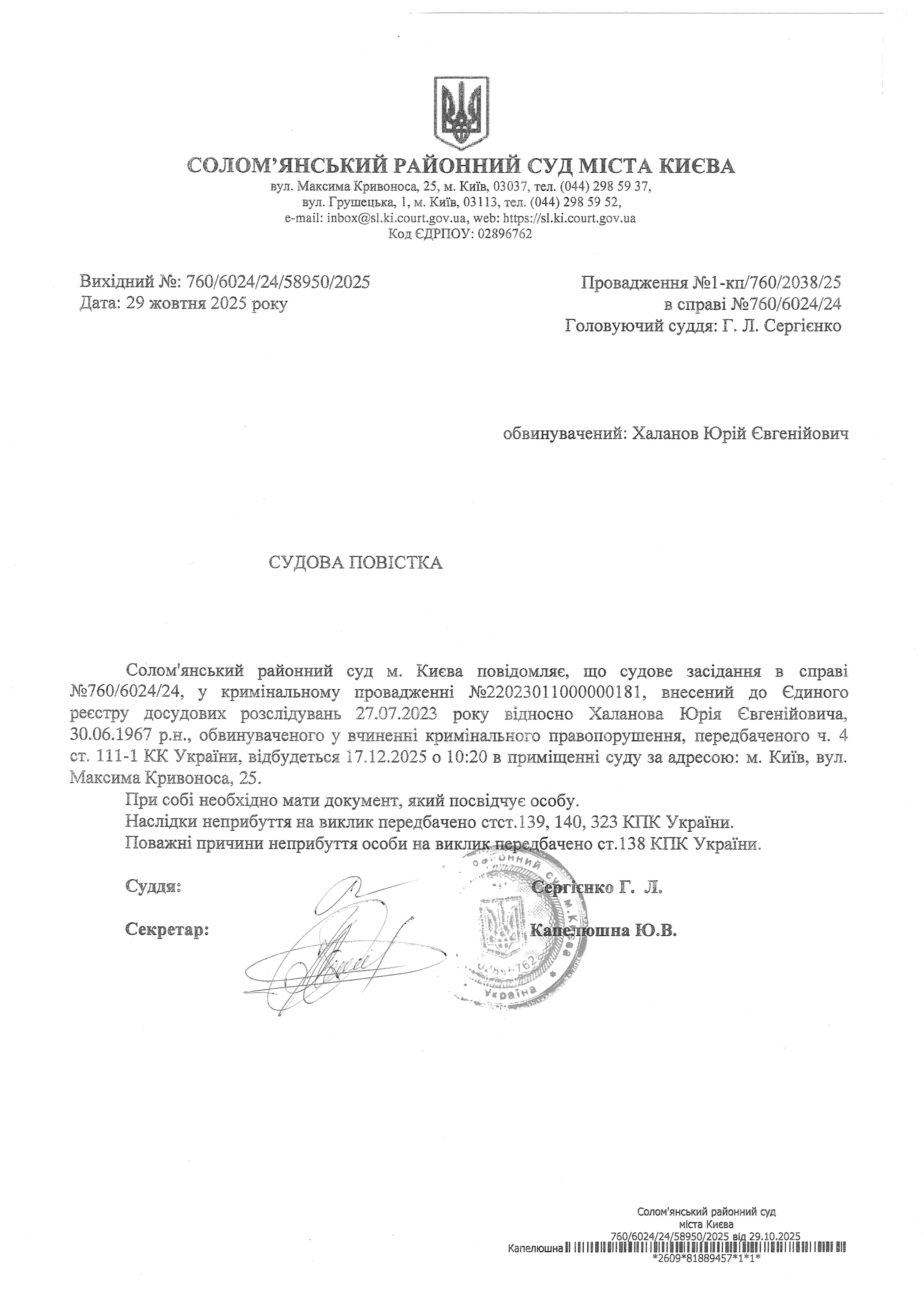 Оголошення про виклик до суду про справі 760/6024/24 Халанов Ю.Є.