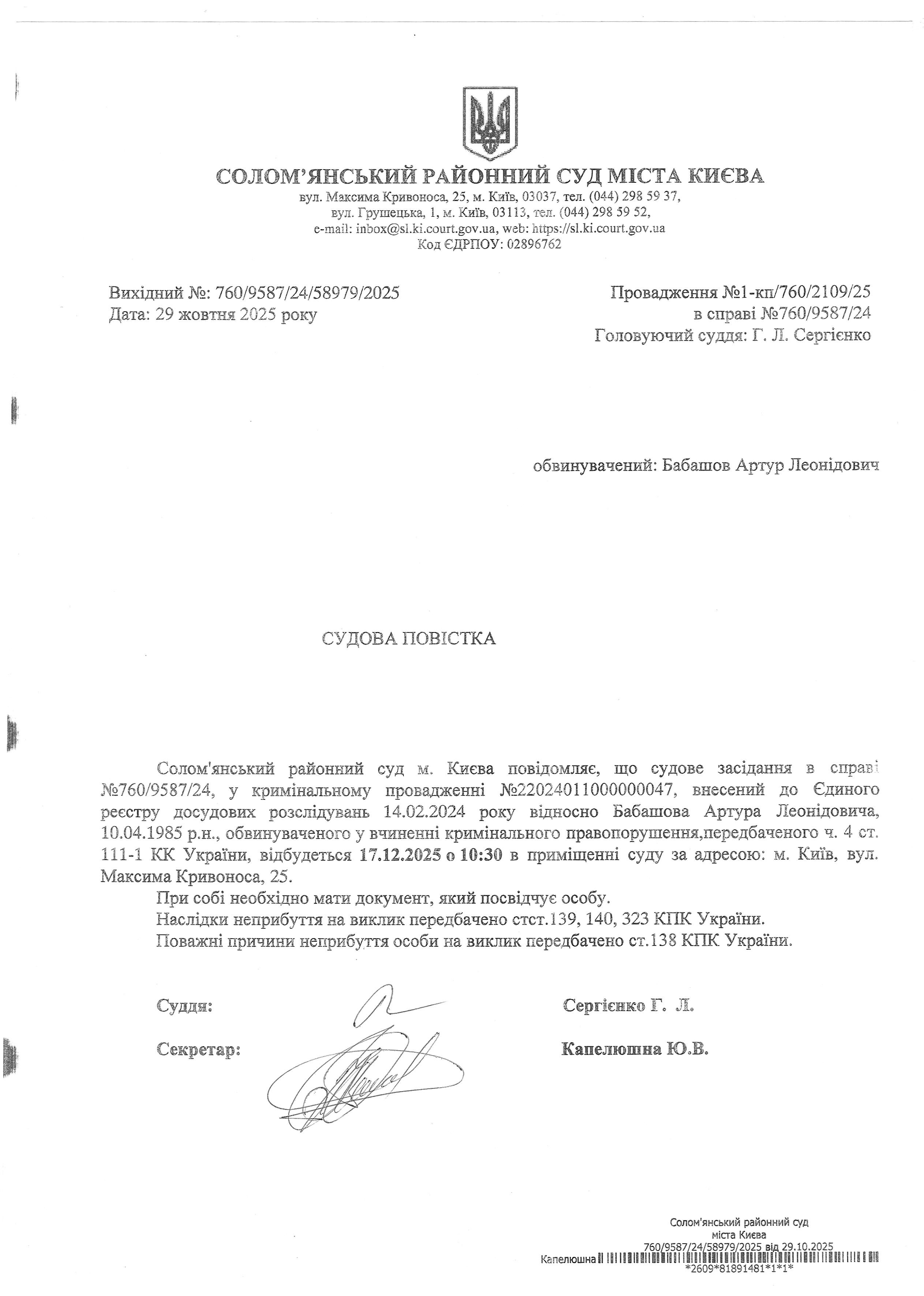 Оголошення про виклик до суду про справі 760/9587/24 Бабашов А.Л.