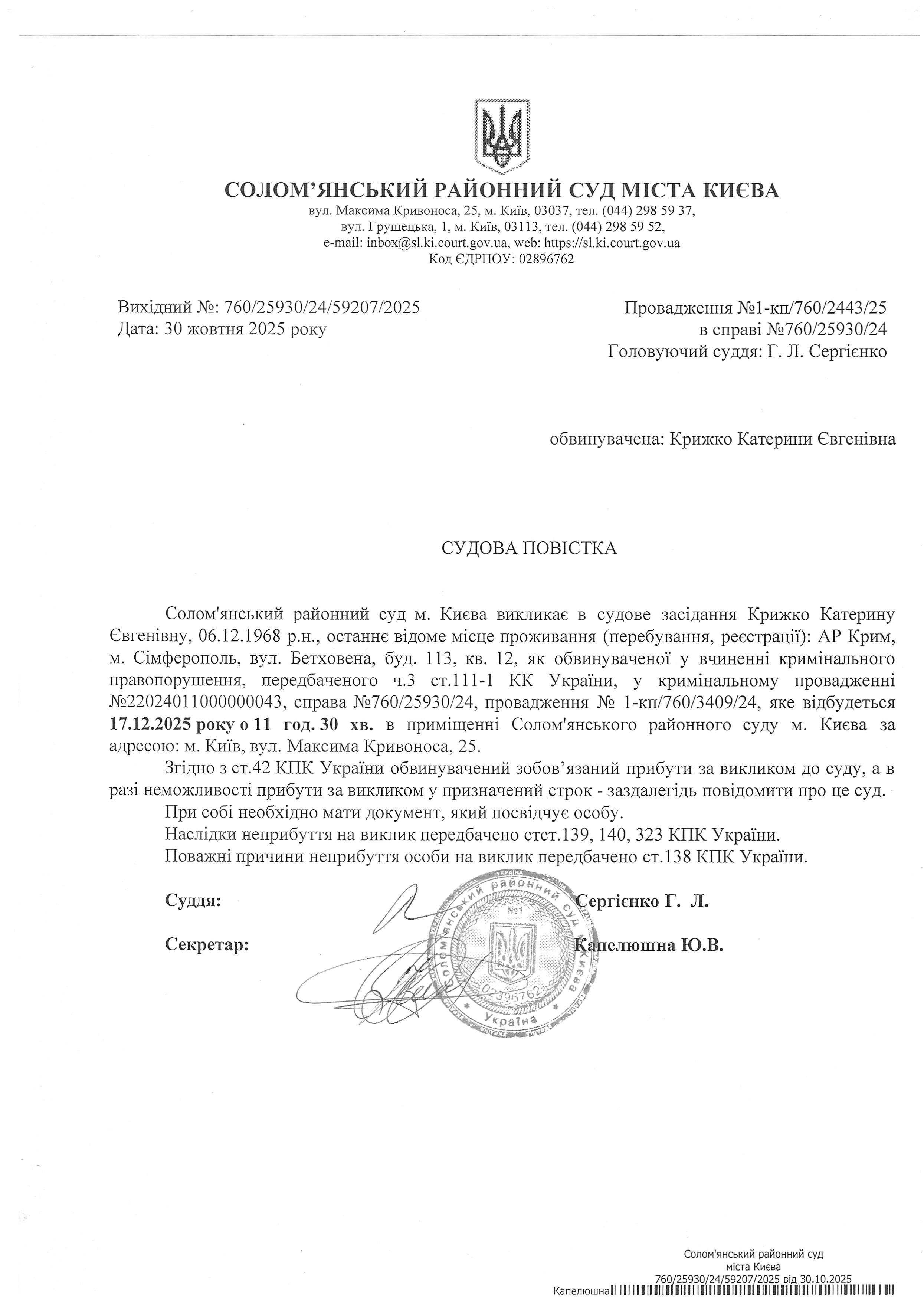 Оголошення про виклик до суду про справі 760/25930/24 Крижко К.Є.