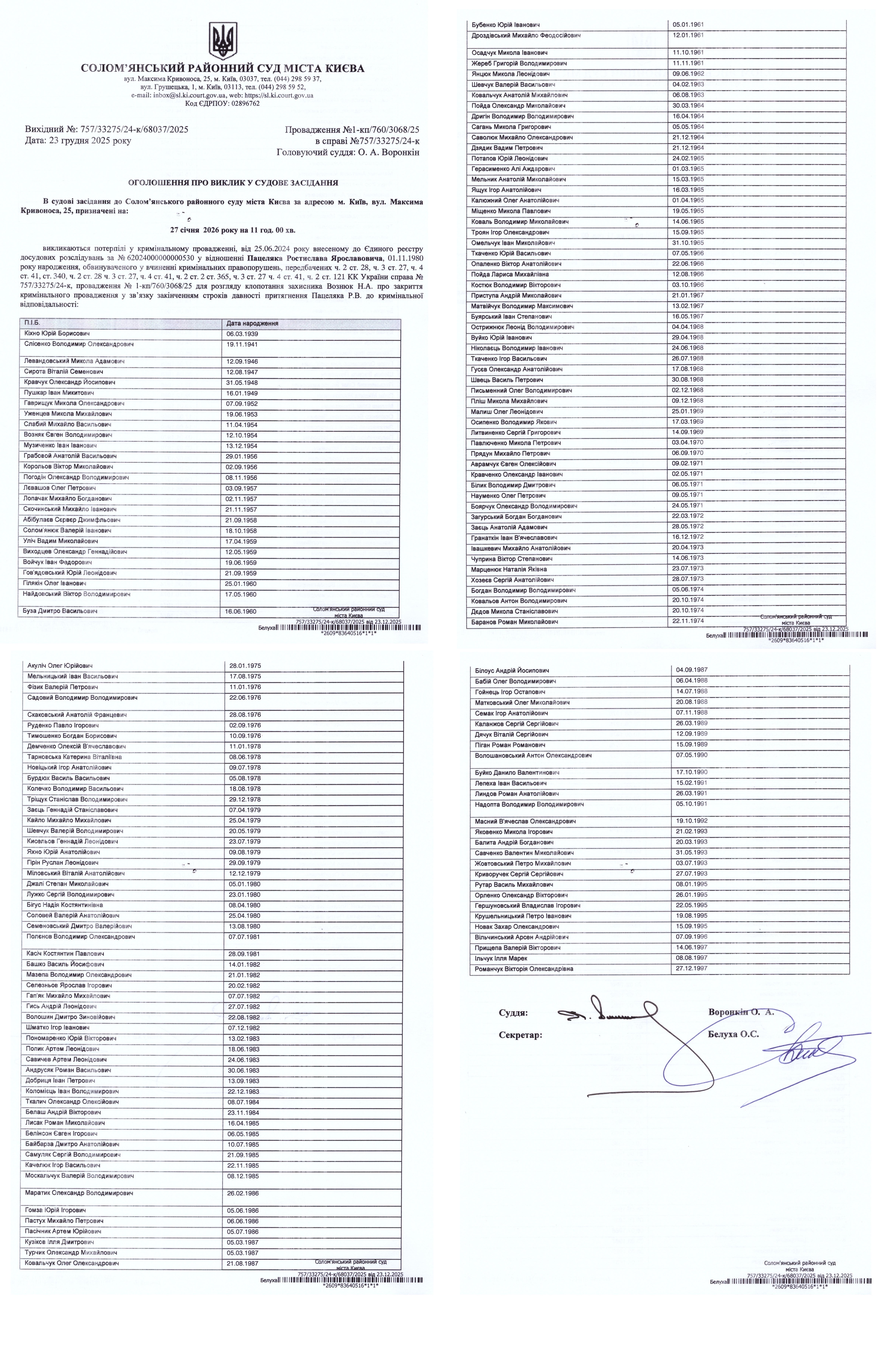 Оголошення про виклик до суду про справі 757/33275/24-к Пацеляк Р.Я.