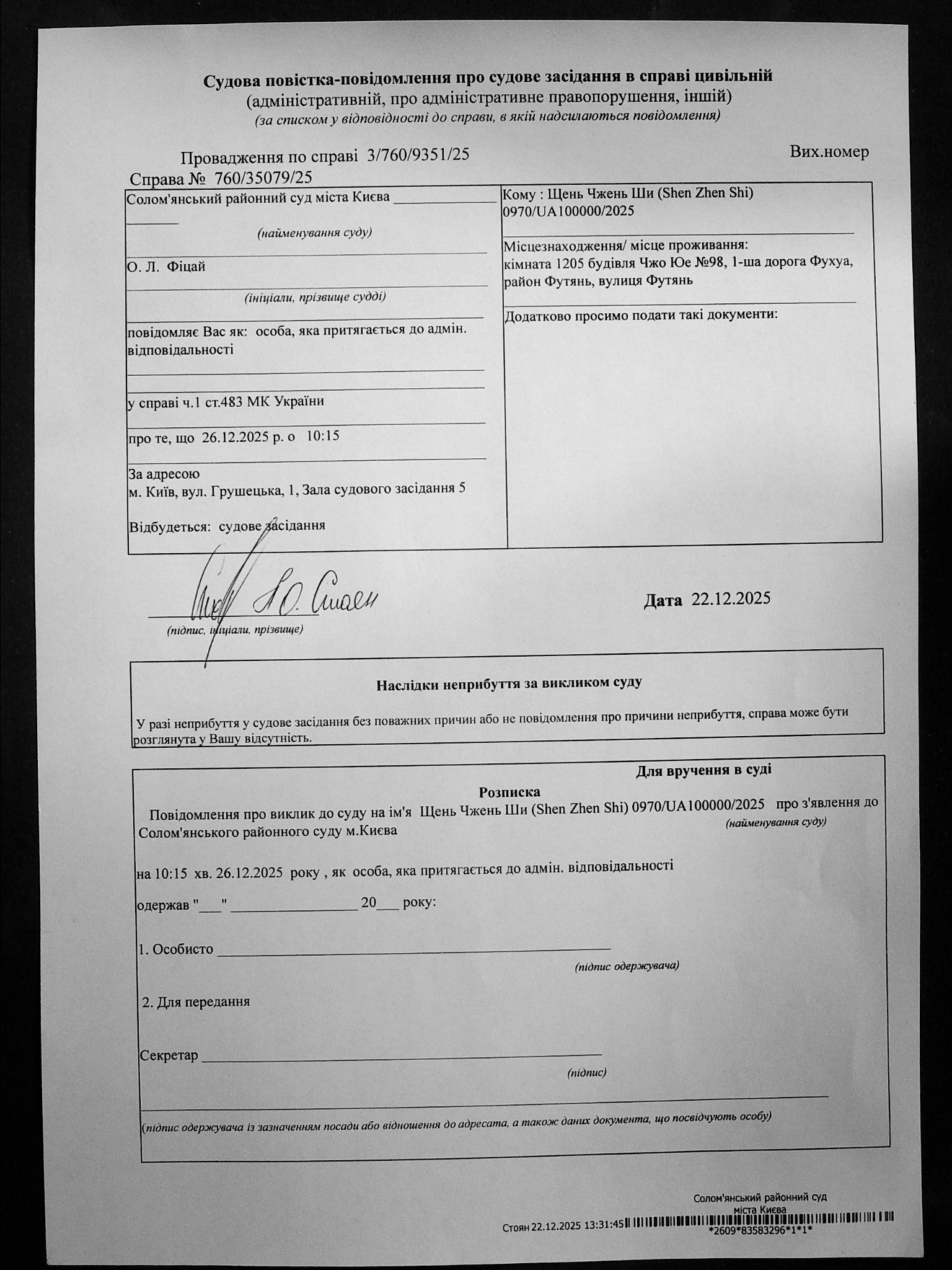 Оголошення про виклик до суду про справі 760/35079/25 Щень Чжень Ши