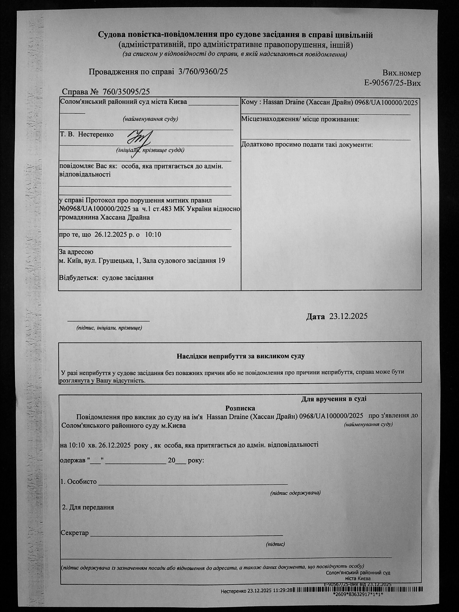 Оголошення про виклик до суду про справі 760/35095/22 Хассан Драйн