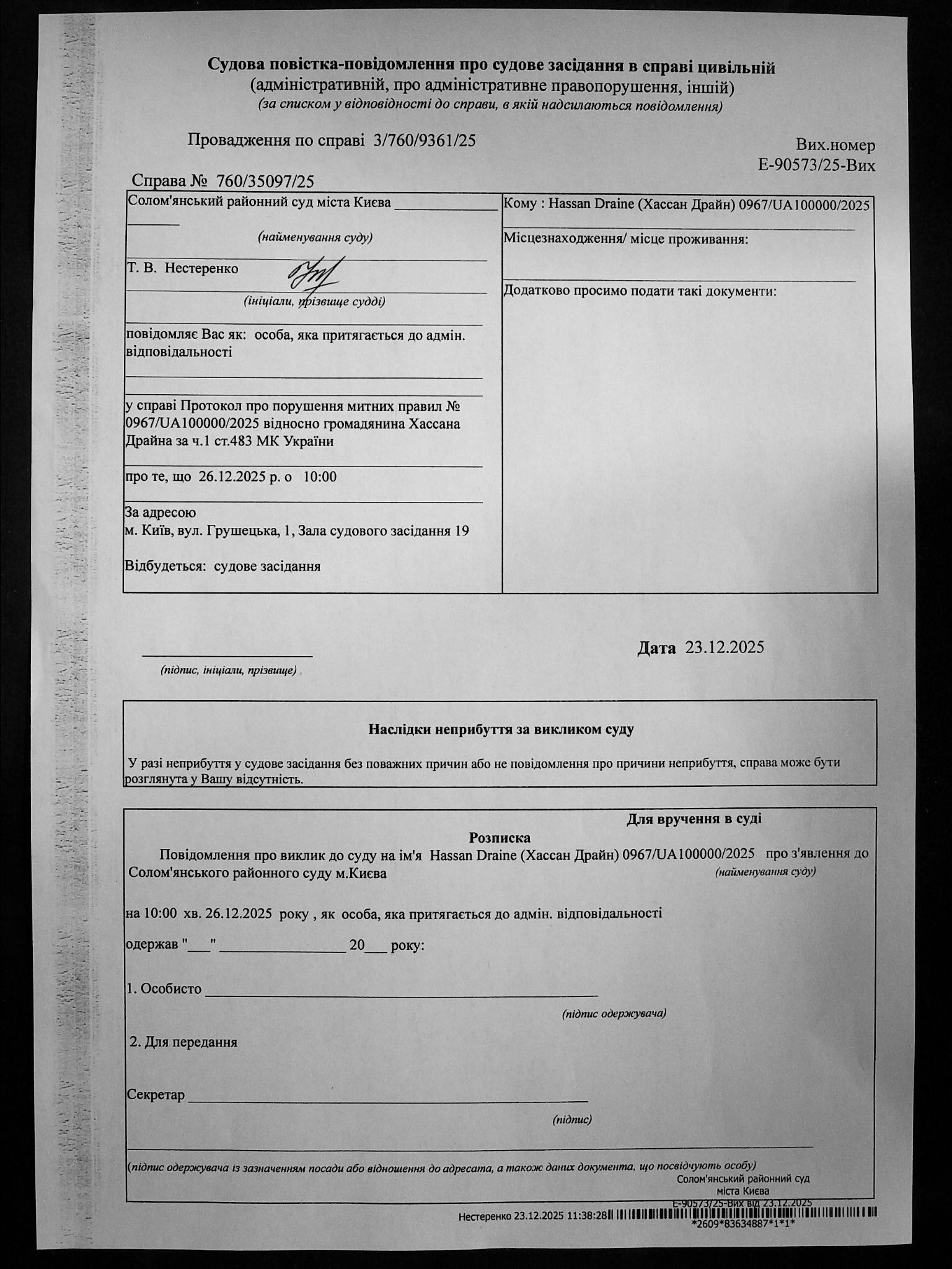 Оголошення про виклик до суду про справі 760/35097/25 Хассан Драйн